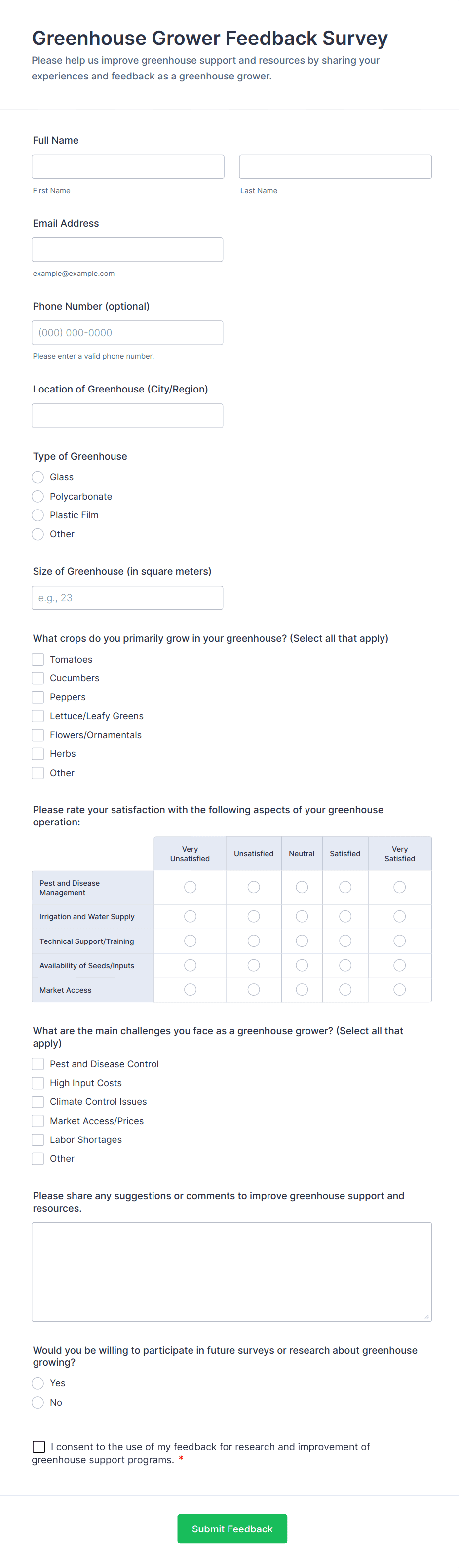 • For customer feedback, include questions about satisfaction, product quality, and likelihood to recommend.