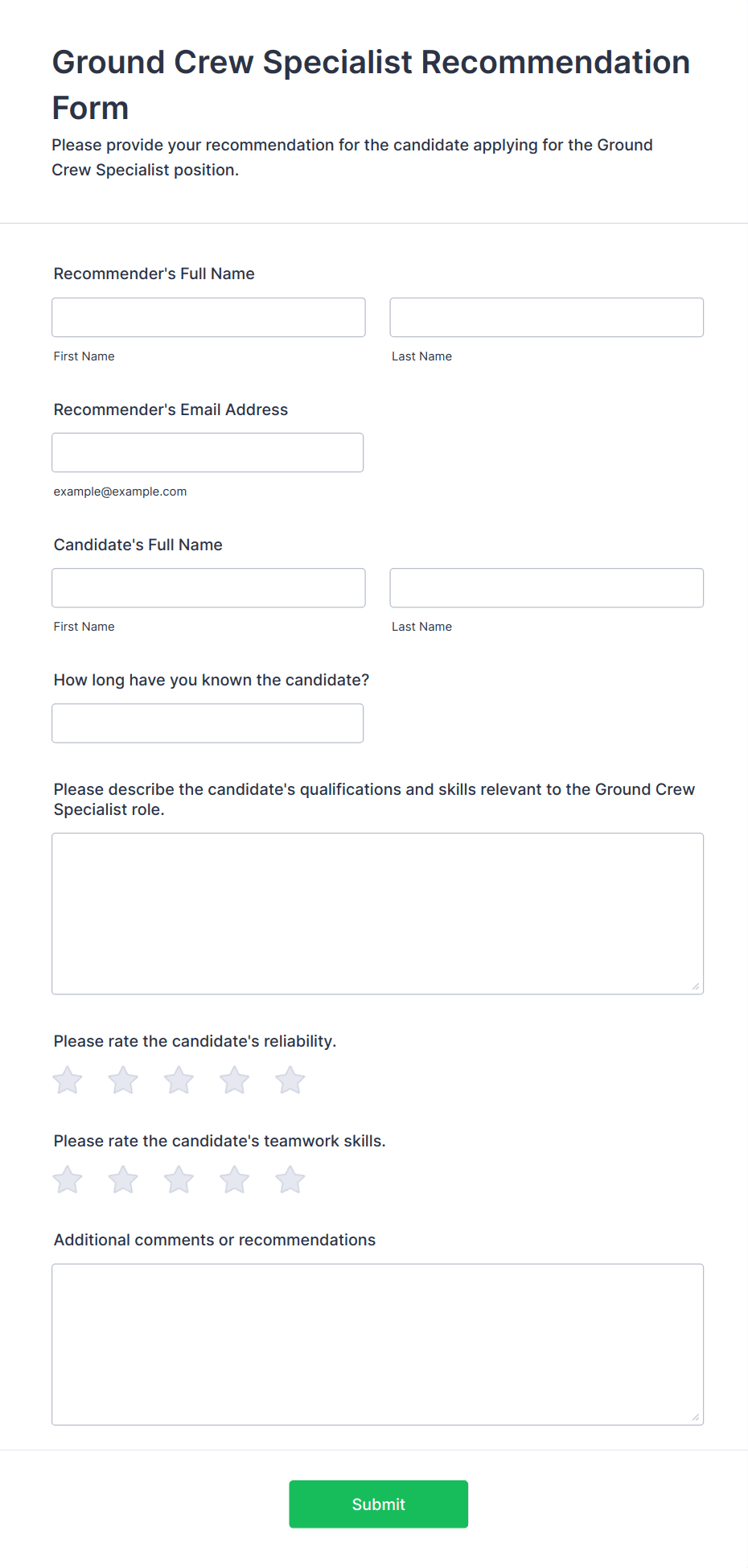 Common fields include the recommender’s contact details, relationship to the applicant, ratings on specific skills or attributes, and open-ended comments or examples.