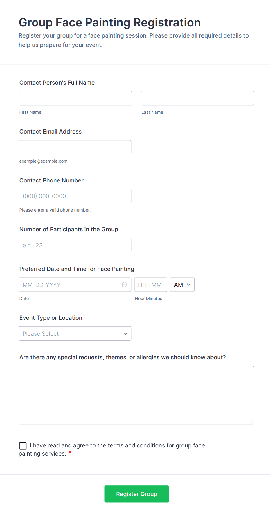 Event Registration Forms are digital tools designed to streamline the process of collecting attendee information for a wide variety of events, such as conferences, workshops, webinars, fundraisers, classes, and social gatherings. These forms allow organizers to gather essential details like participant names, contact information, payment preferences, dietary restrictions, and session selections. By using event registration forms, event planners can efficiently manage RSVPs, track attendance, and ensure a smooth check-in process on the day of the event. The flexibility of these forms makes them suitable for both small private gatherings and large-scale public events, adapting to the unique requirements of each occasion.