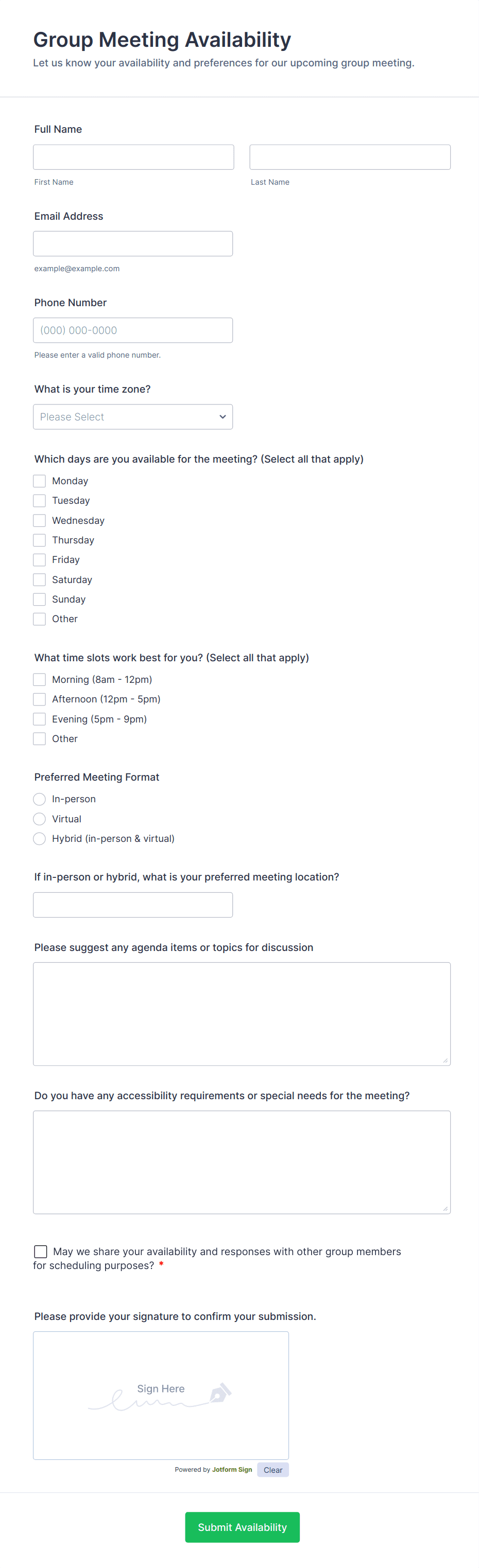 Move your meetings online with free Meeting Forms from Jotform. Whether you want to schedule a meeting, check meeting attendance, collect signups, plan itineraries, or otherwise, our ready-made form templates can get you started in no time. Simply pick a template that works for you and customize it with our intuitive online builder.