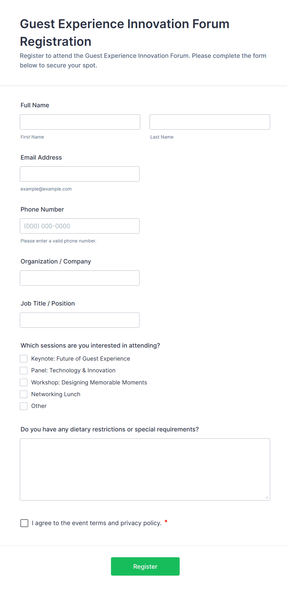 • For speaker or exhibitor forms, add fields for presentation topics, company details, or booth preferences.