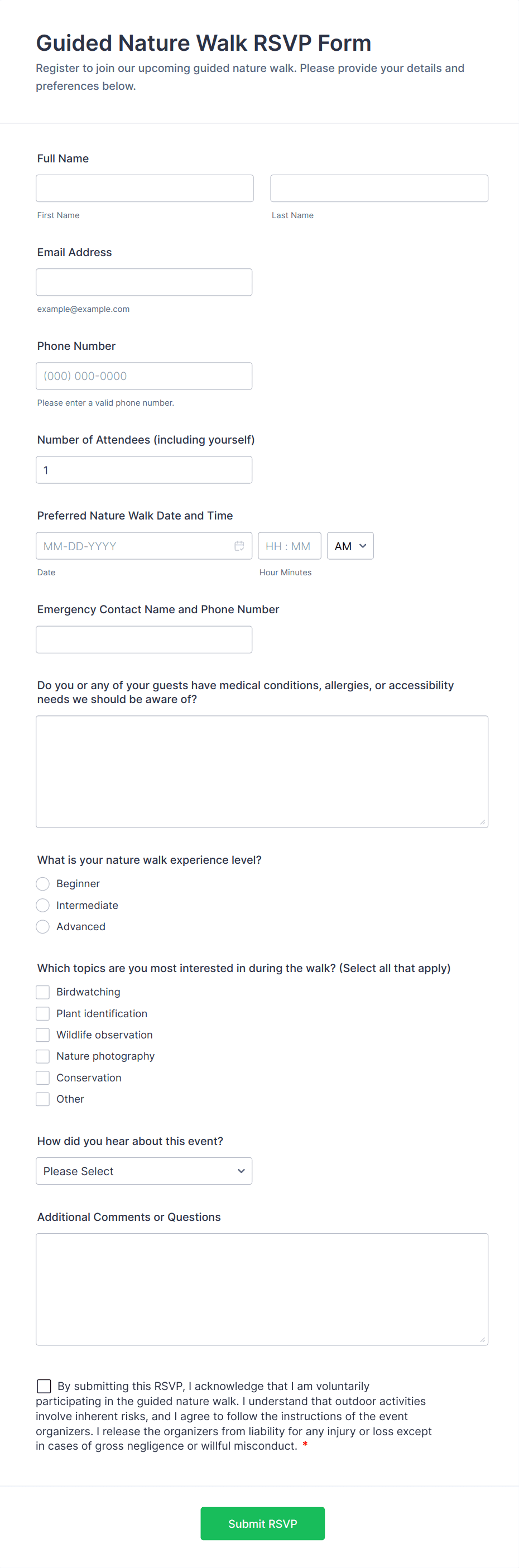 • For casual gatherings, a simple yes/no attendance field and contact information may suffice.