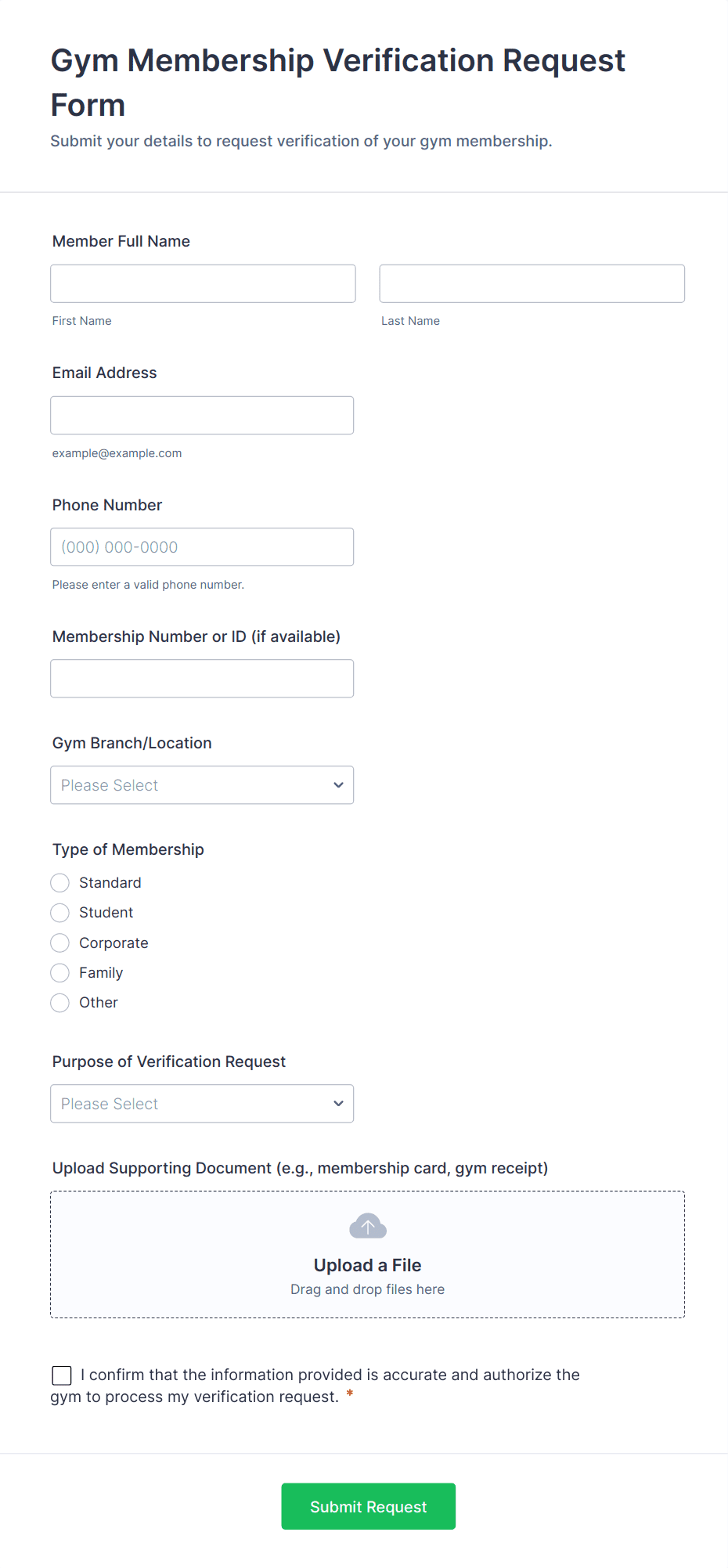 Verification forms are specialized digital tools designed to authenticate, validate, or confirm information provided by individuals or organizations. These forms are commonly used to verify identities, credentials, employment status, addresses, or other critical data points in a secure and efficient manner. Typical use cases include onboarding new employees, confirming student enrollment, validating customer identities for financial services, or ensuring the accuracy of submitted documents in compliance processes. By streamlining the verification process, these forms help organizations reduce fraud, maintain regulatory compliance, and build trust with their stakeholders.