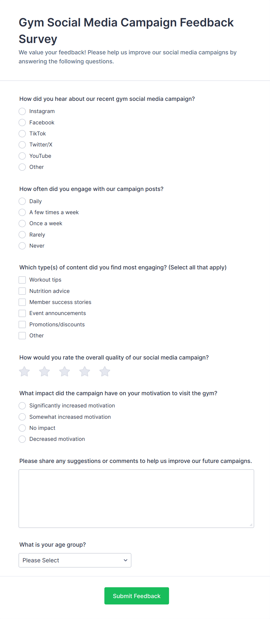 • Product Feedback: Add product-specific questions, feature checklists, and suggestion boxes.