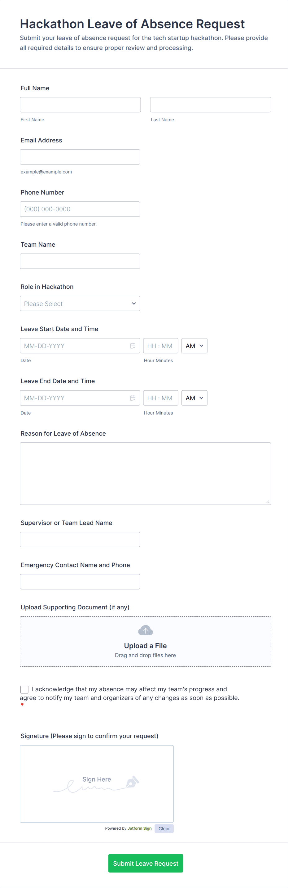 Each leave of absence form should include details like personal contact information, the duration of and reason for the absence, and any supporting documents. In Jotform’s collection of leave of absence form templates, you can find a vacation request form, a school staff leave form, a military leave form, and much more. Simply select the template of your choice and customize it to suit your needs in minutes with our drag-and-drop form builder. Jotform can help you get organized, streamline your workflows, and keep track of employee absences online with our leave of absence form templates.