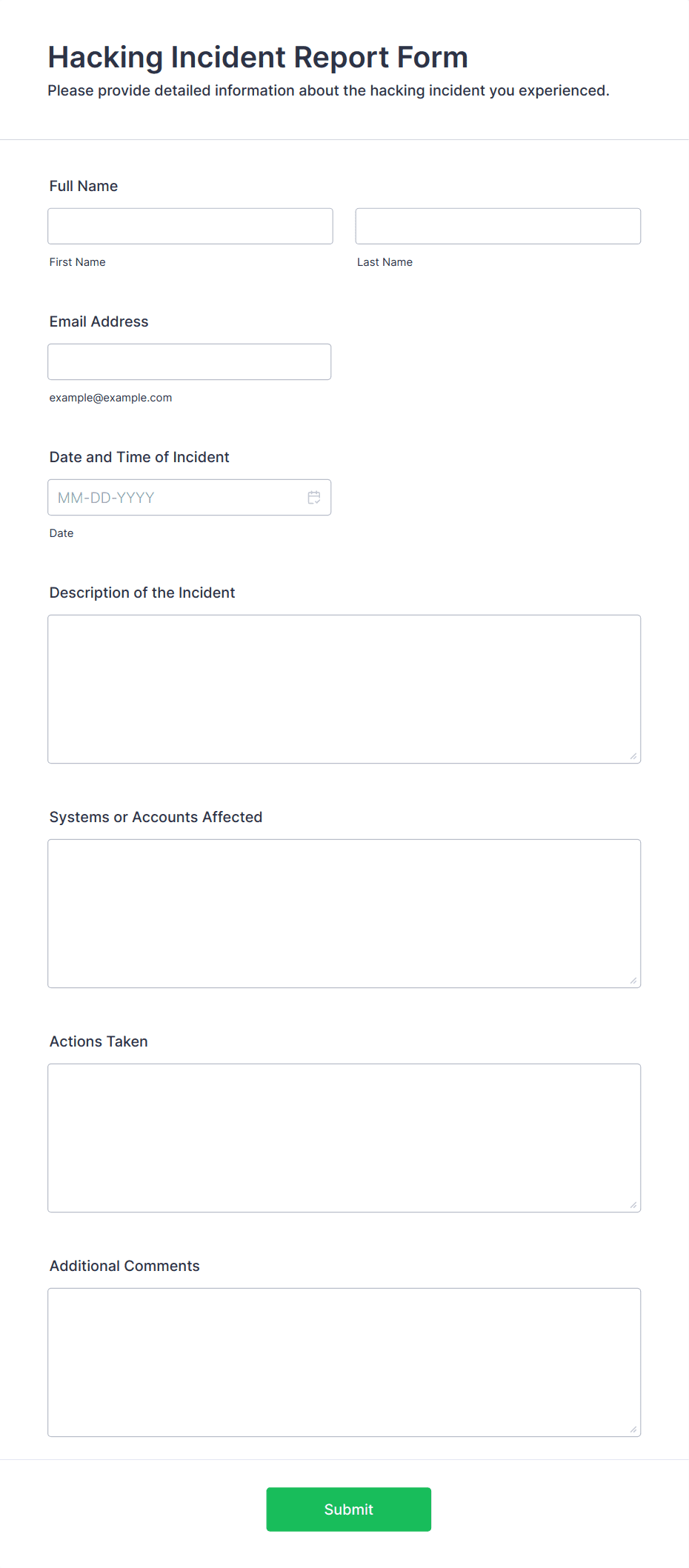 An IT Incident Report Form is a form template designed to streamline the reporting and resolution process of IT-related incidents for businesses.