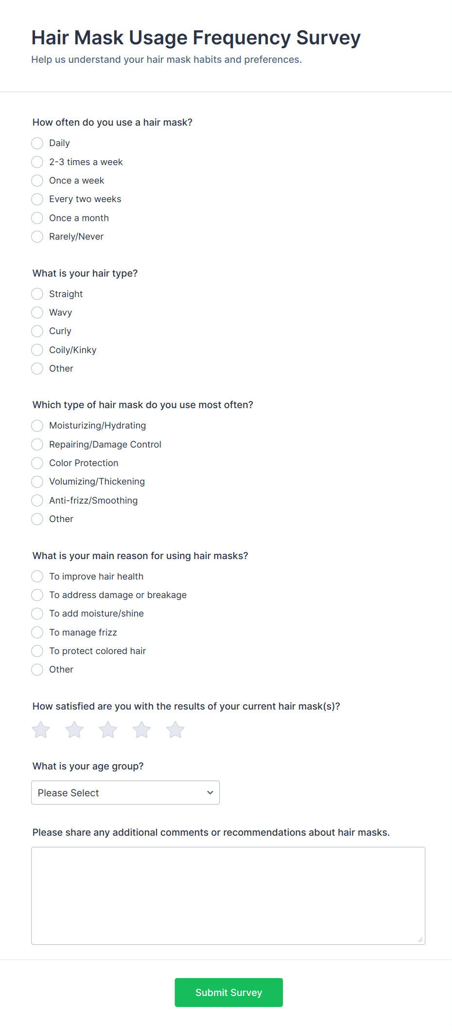Product Survey Templates are pre-designed forms specifically created to help businesses, product managers, marketers, and researchers gather valuable feedback about products from customers, users, or stakeholders. These templates are used to assess customer satisfaction, collect suggestions for improvement, evaluate product features, and understand user experiences. Product survey forms can be utilized at various stages of a product’s lifecycle — from initial concept testing and beta launches to post-purchase feedback and ongoing product improvement. Common use cases include new product feedback, feature prioritization, usability testing, and post-launch satisfaction surveys.