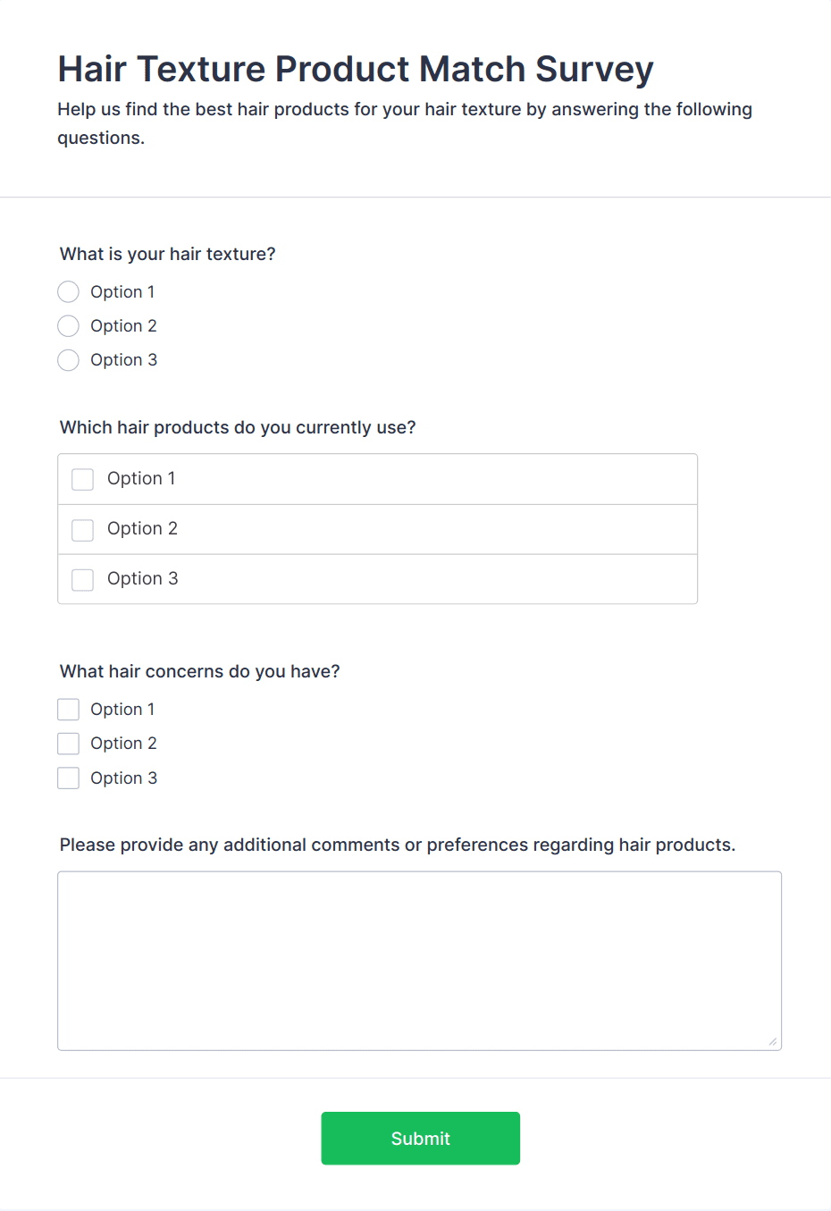 Product Survey Templates are pre-designed forms specifically created to help businesses, product managers, marketers, and researchers gather valuable feedback about products from customers, users, or stakeholders. These templates are used to assess customer satisfaction, collect suggestions for improvement, evaluate product features, and understand user experiences. Product survey forms can be utilized at various stages of a product’s lifecycle — from initial concept testing and beta launches to post-purchase feedback and ongoing product improvement. Common use cases include new product feedback, feature prioritization, usability testing, and post-launch satisfaction surveys.