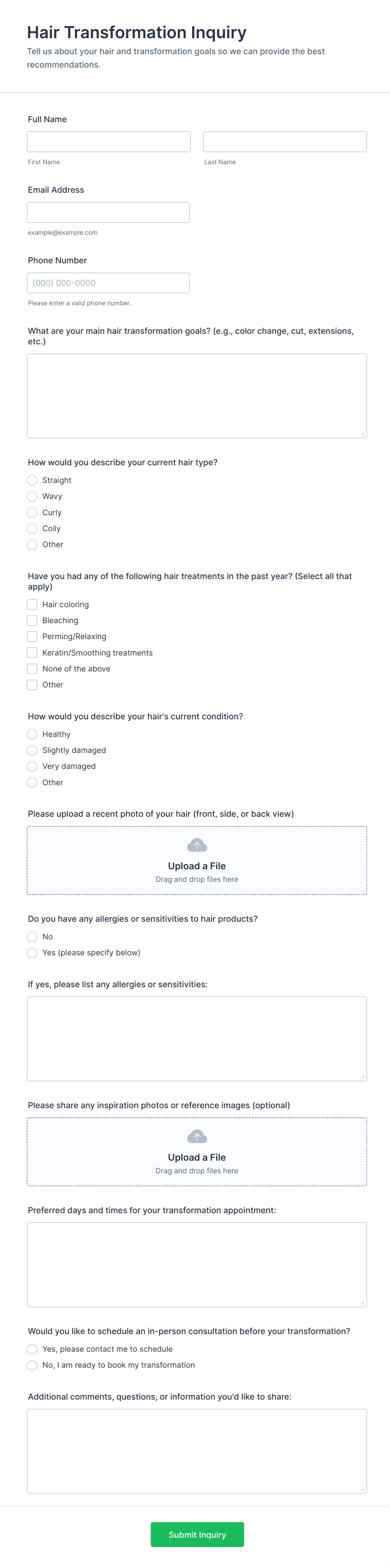 Know your client's needs and preferences by having them fill up this Hair Consultation Form before scheduling an appointment. This form can be accessed on any desktop, laptop, or mobile device.