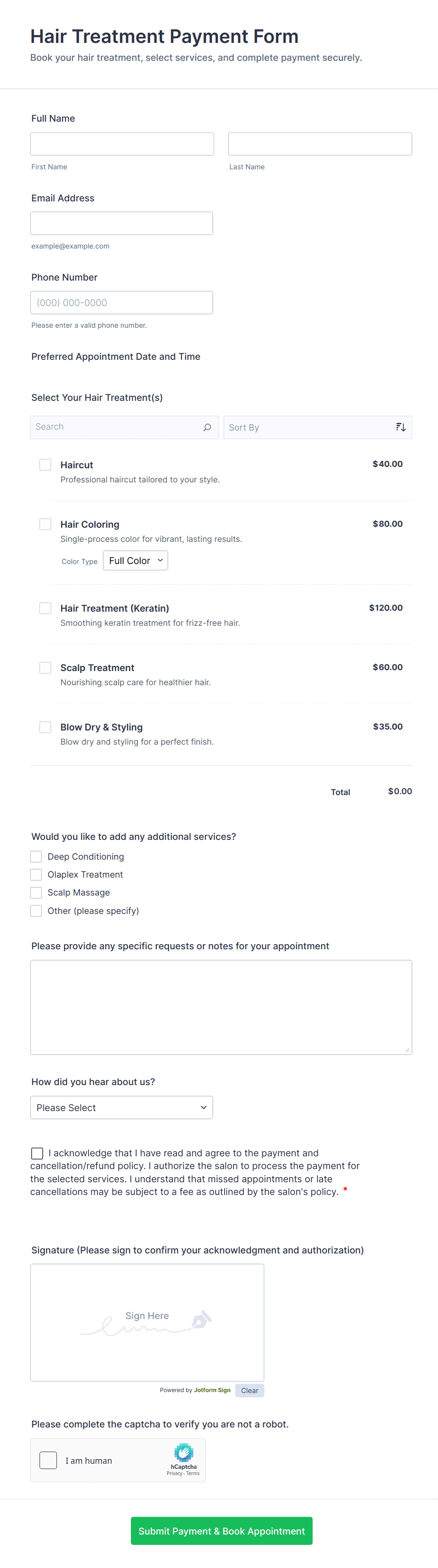 - Service booking forms may require date/time pickers and service selection alongside payment.