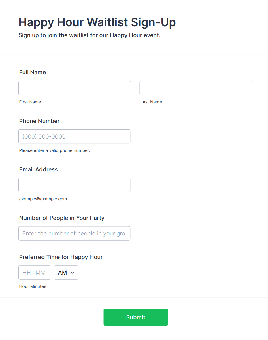 • Content and Fields: A concert booking form may require seat selection and payment integration, while a workshop sign-up might focus on participant details and session preferences. Private event RSVPs may include meal choices or guest information, whereas facility reservations could need date/time selectors and equipment checklists.