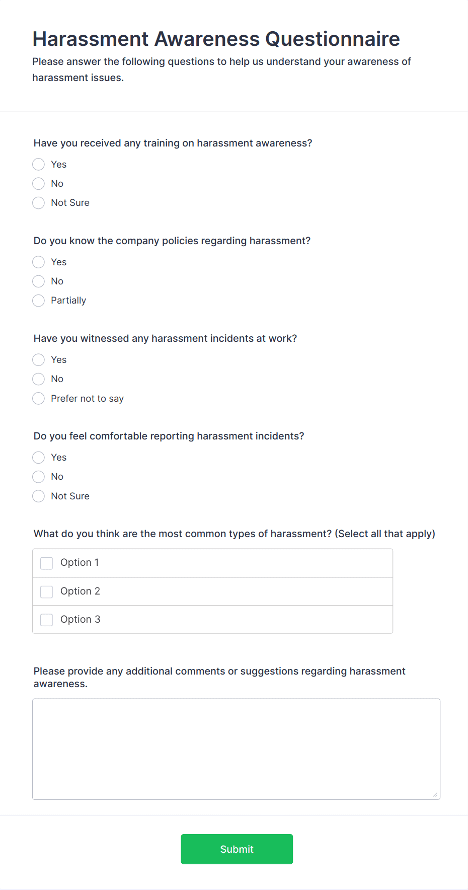 Questionnaire templates are pre-designed forms used to collect structured information from respondents for a variety of purposes, such as research, feedback, assessments, and evaluations. These templates can be tailored to suit different industries and objectives, including customer satisfaction surveys, employee engagement assessments, academic research, health screenings, and market research studies. By providing a consistent framework for gathering data, questionnaire templates help organizations and individuals streamline the process of collecting, analyzing, and acting on valuable insights.