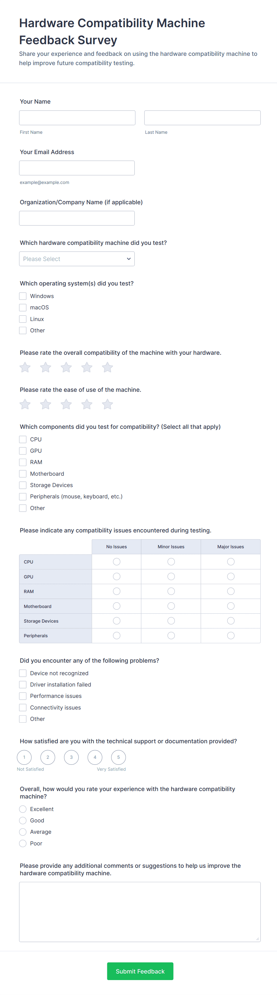 Typical fields include demographic information, technology usage patterns, satisfaction ratings, open-ended feedback, and specific questions about software, hardware, or digital skills.