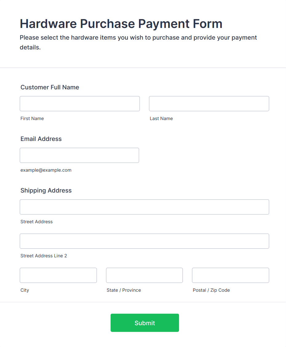 Payment forms are specialized online forms designed to securely collect payments, donations, fees, or orders from customers, clients, or donors. These forms are commonly used by businesses, nonprofits, educational institutions, and service providers to facilitate transactions such as product sales, event registrations, membership fees, or charitable contributions. Payment forms streamline the payment process by allowing users to enter their payment details directly on the form, often integrating with popular payment gateways like PayPal, Stripe, or Square. This eliminates the need for manual invoicing or offline payment collection, making transactions faster and more convenient for both parties.