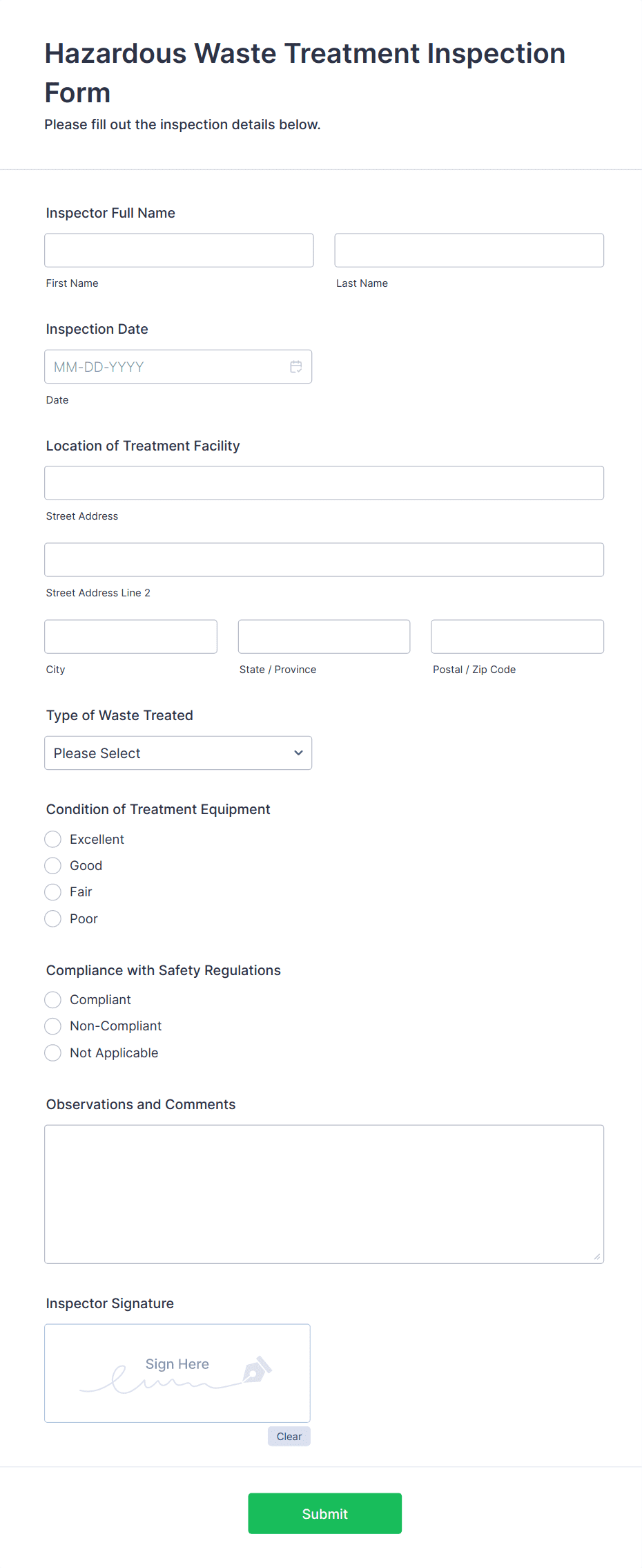 An inspection form is a structured document used to assess, record, and report the condition, compliance, or quality of assets, environments, or processes during an inspection.