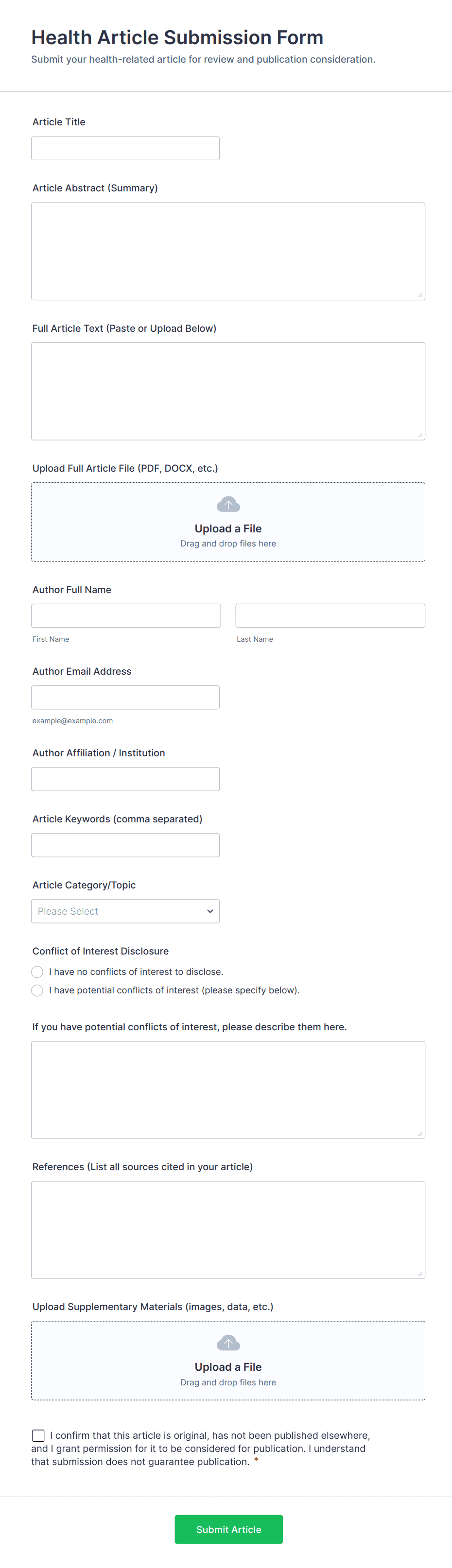 • Editorial submission forms may require fields for author bio, article title, and file uploads