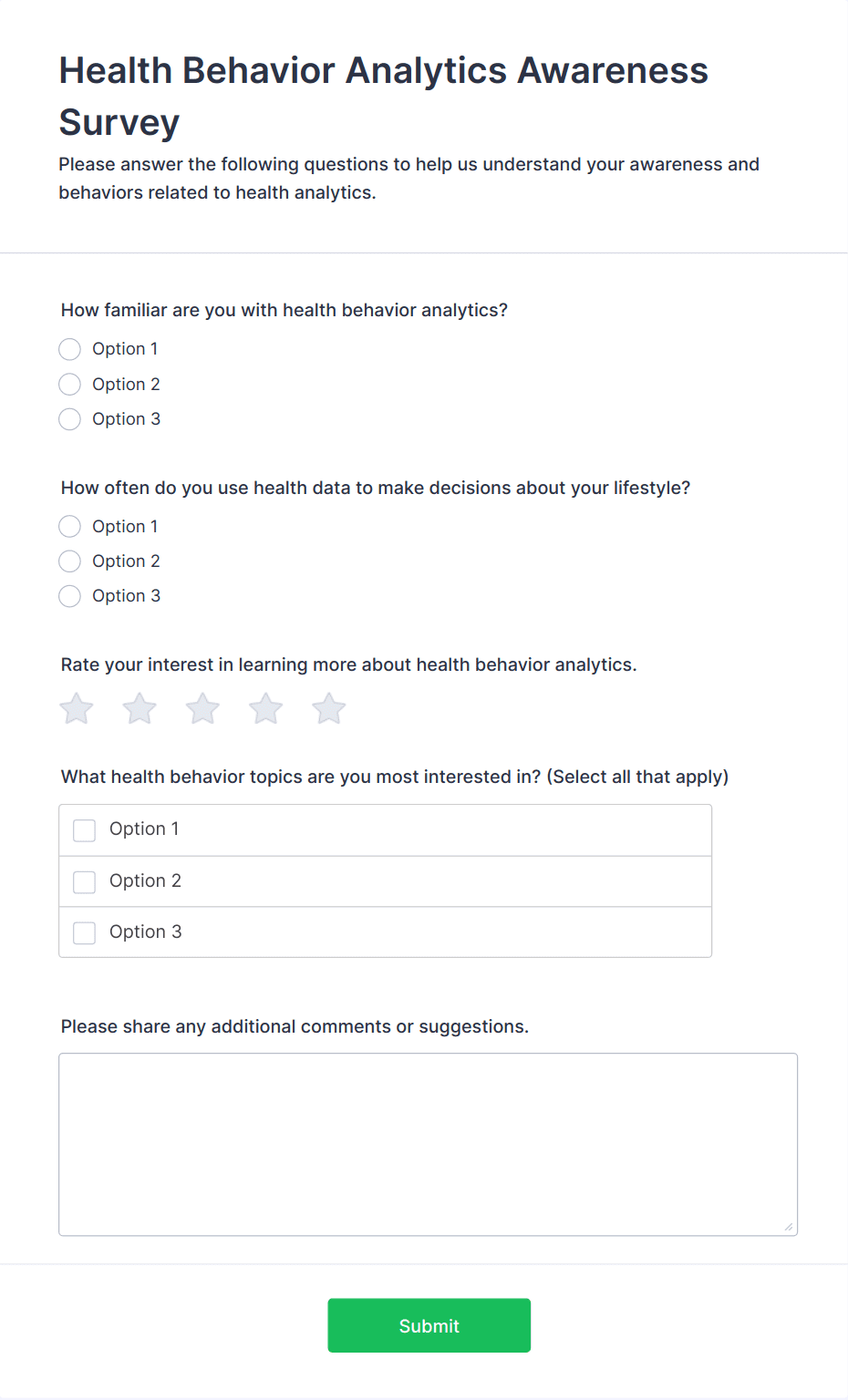 Healthcare surveys are specialized questionnaires designed to collect valuable information from patients, healthcare professionals, and other stakeholders within the medical field. These surveys can be used for a variety of purposes, such as assessing patient satisfaction, gathering feedback on healthcare services, monitoring public health trends, evaluating treatment outcomes, and conducting research studies. Healthcare organizations, clinics, hospitals, and research institutions rely on these surveys to improve patient care, streamline operations, and ensure compliance with industry standards.
