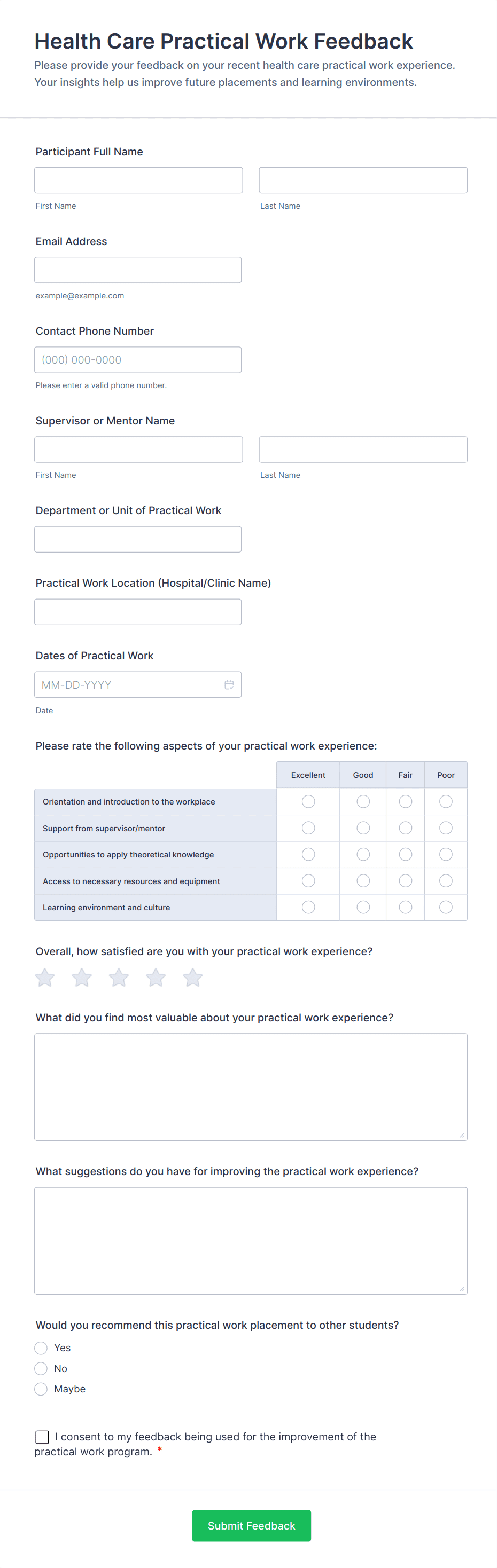 • Health-specific fields: Multiple choice for symptoms, rating scales for satisfaction, long text for open feedback.