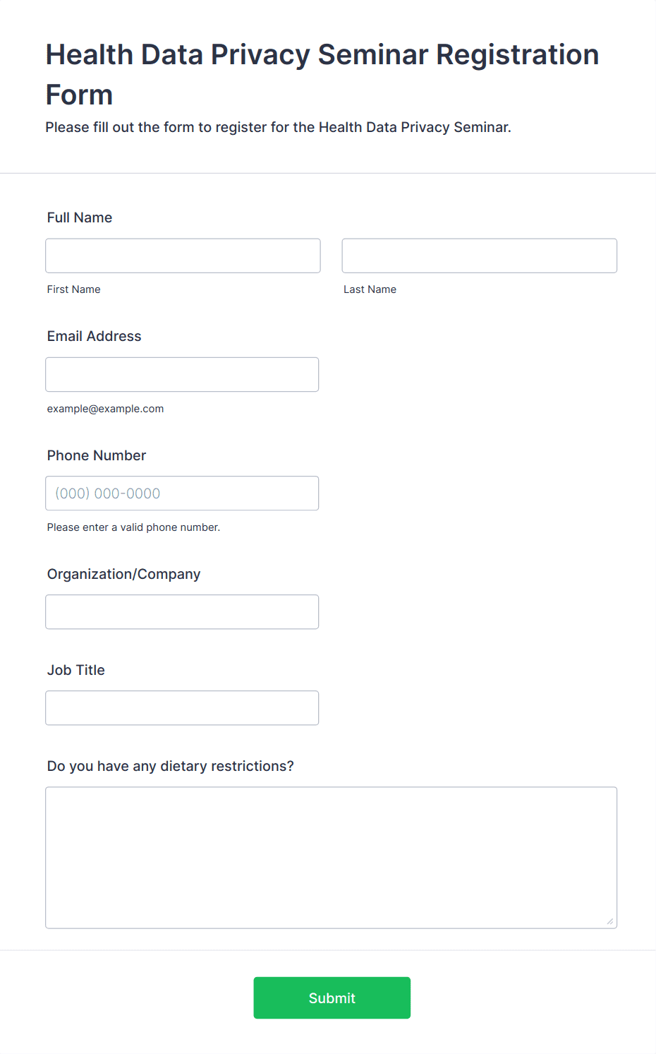 A workshop RSVP form that provides your submitters with all necessary information related to the event and allows gathering your submitters' company and title information with their contact details.