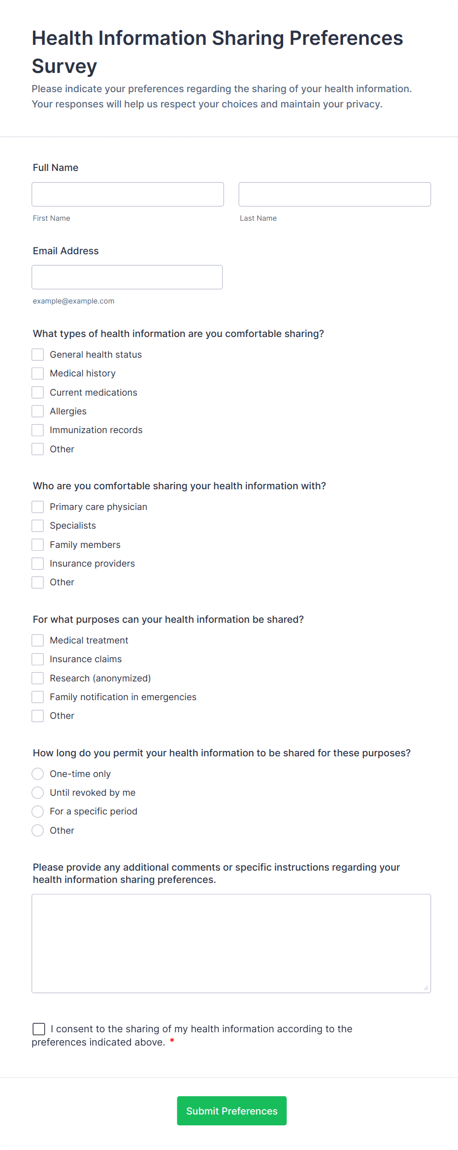 • For health risk assessments, include checkboxes or multiple-choice questions about lifestyle, family history, and specific risk factors.