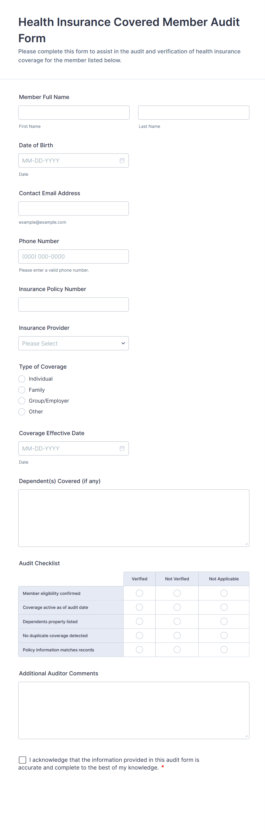 Audit Form is a form template designed to streamline and simplify the audit process in any sector. It's the perfect solution to conduct thorough inspections, track data, and ensure full regulatory compliance.