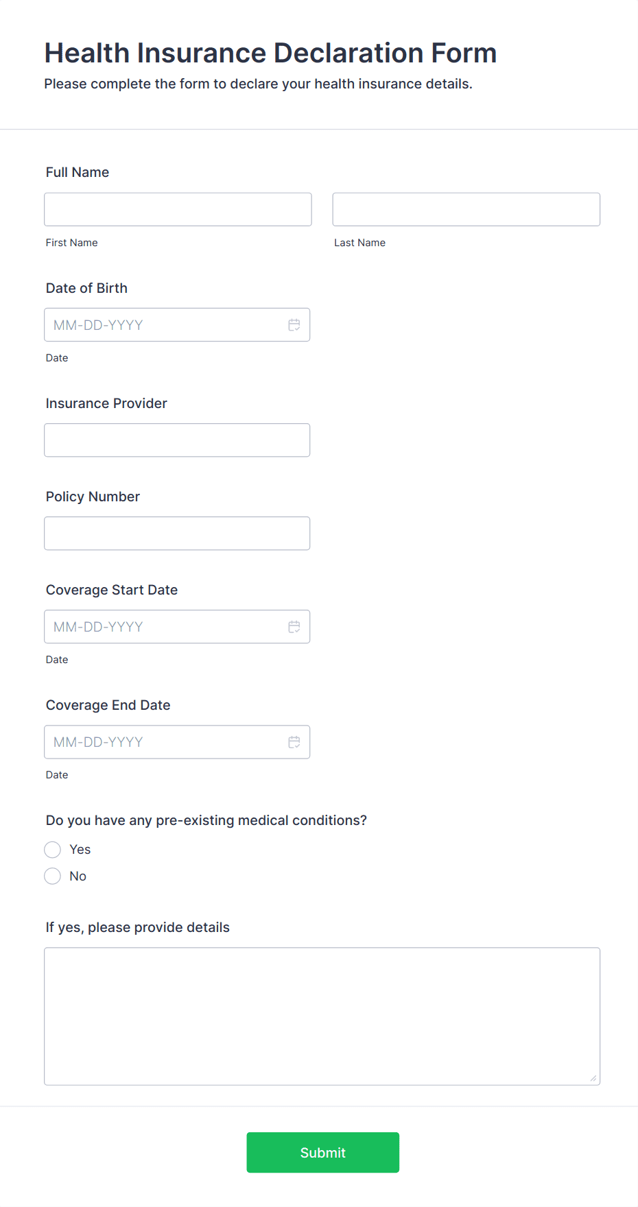 An insurance form is a document used to collect information related to insurance policies, claims, applications, or updates. It helps insurance providers gather necessary data from clients or policyholders efficiently.