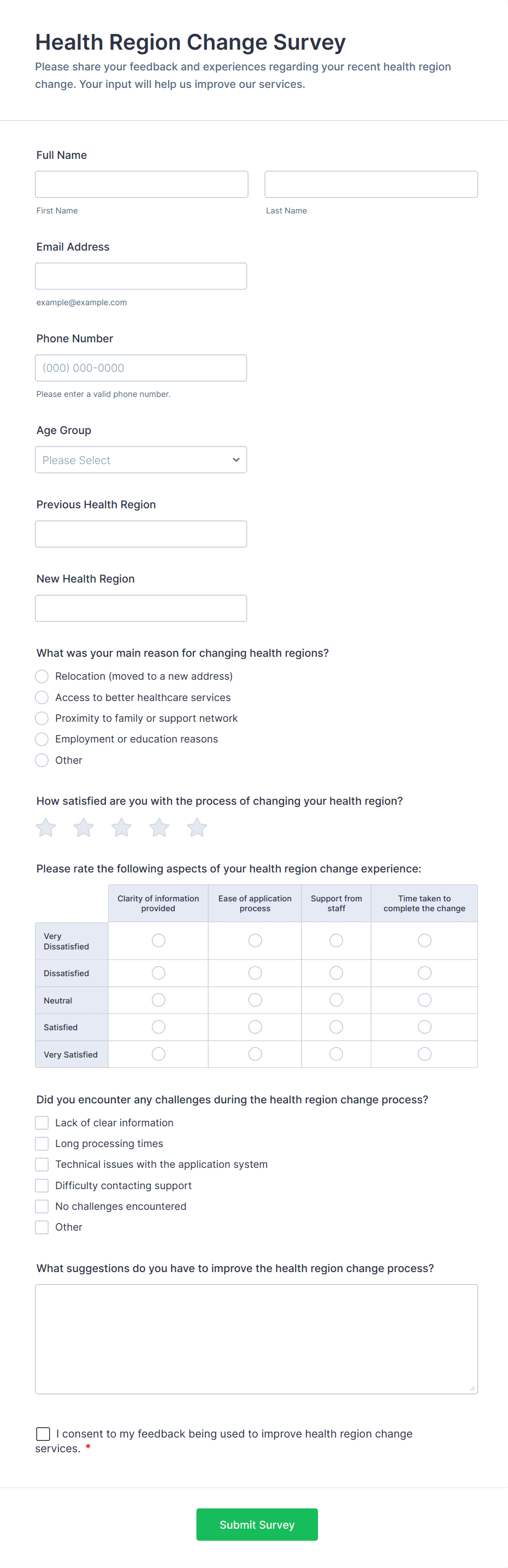 Healthcare surveys are specialized questionnaires designed to collect valuable information from patients, healthcare professionals, and other stakeholders within the medical field. These surveys can be used for a variety of purposes, such as assessing patient satisfaction, gathering feedback on healthcare services, monitoring public health trends, evaluating treatment outcomes, and conducting research studies. Healthcare organizations, clinics, hospitals, and research institutions rely on these surveys to improve patient care, streamline operations, and ensure compliance with industry standards.