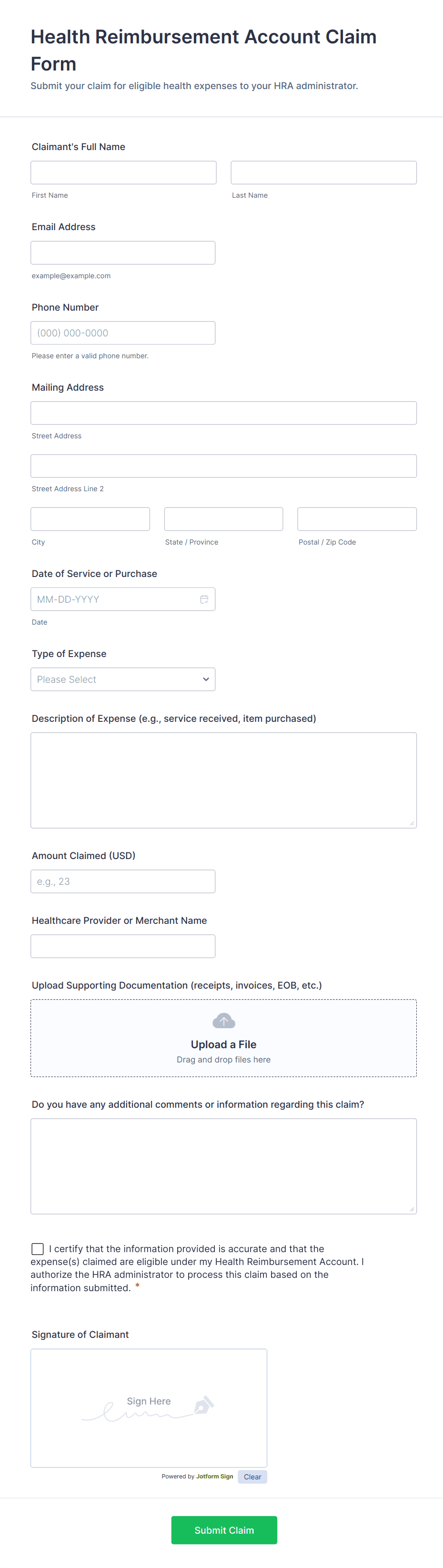 Collect and manage vision expense reimbursement requests with the Vision Care HSA Reimbursement Claim Form in Jotform, making it easy for employees and benefits teams to handle data collection and track each form submission online.