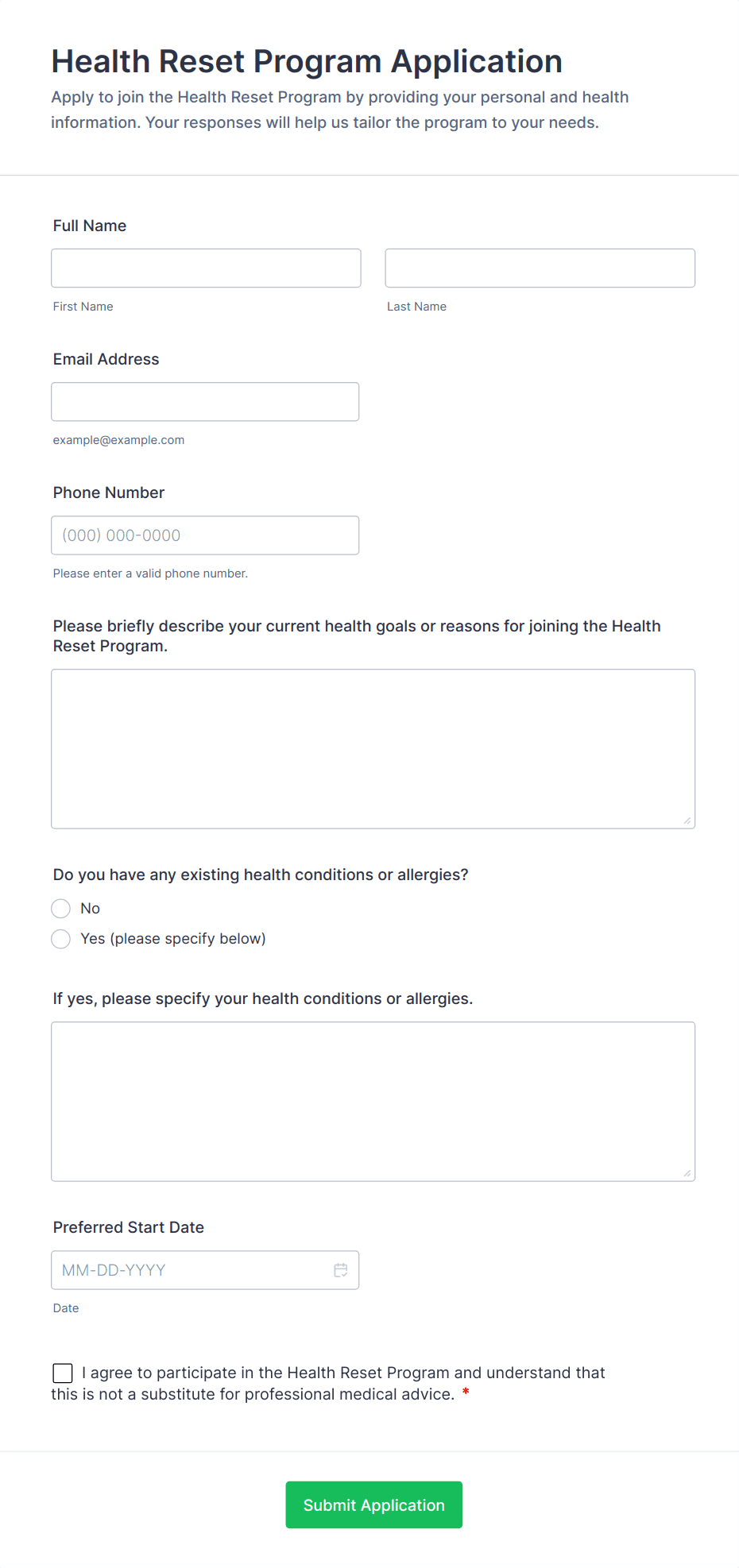 Are you a health coach looking for a convenient way to gather information from your patients? Streamline your intake process with these free Health Coach Forms from Jotform. Choose a form template below to start collecting responses from questionnaires, surveys, and patient health assessments from any device. Customize your forms without any coding with Jotform’s intuitive form builder. Simply drag and drop to add form elements, edit text fields and checklist items, upload your personal branding, and much more. Go paperless and securely collect and store patient data online with a fully-customizable Health Coach Form.