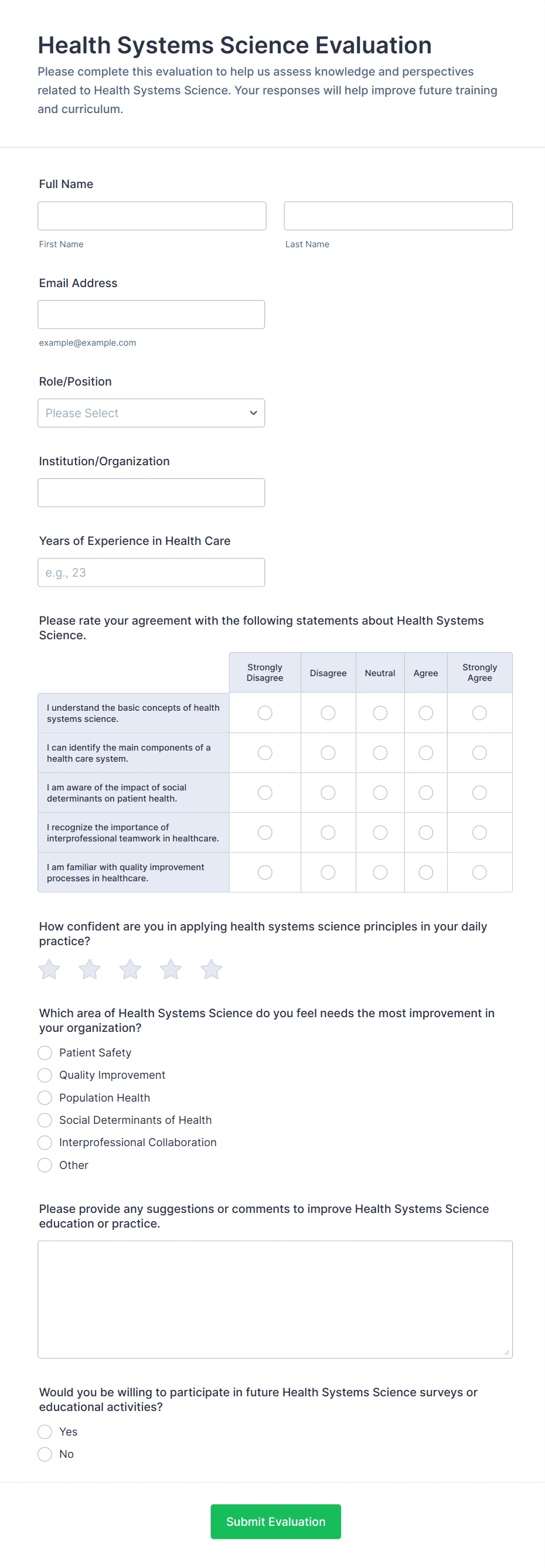 Healthcare surveys are specialized questionnaires designed to collect valuable information from patients, healthcare professionals, and other stakeholders within the medical field. These surveys can be used for a variety of purposes, such as assessing patient satisfaction, gathering feedback on healthcare services, monitoring public health trends, evaluating treatment outcomes, and conducting research studies. Healthcare organizations, clinics, hospitals, and research institutions rely on these surveys to improve patient care, streamline operations, and ensure compliance with industry standards.