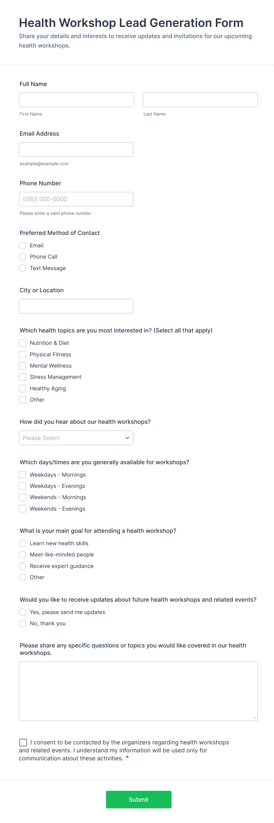 Lead generation forms are specialized online forms designed to capture valuable information from potential customers, clients, or prospects. These forms are commonly used by businesses and organizations to collect contact details, preferences, and other relevant data that can be used to nurture leads and drive sales or engagement. Typical use cases include newsletter sign-ups, event registrations, quote requests, demo bookings, and gated content downloads. By strategically placing lead generation forms on websites, landing pages, or social media, organizations can efficiently gather high-quality leads and streamline their marketing and sales processes.