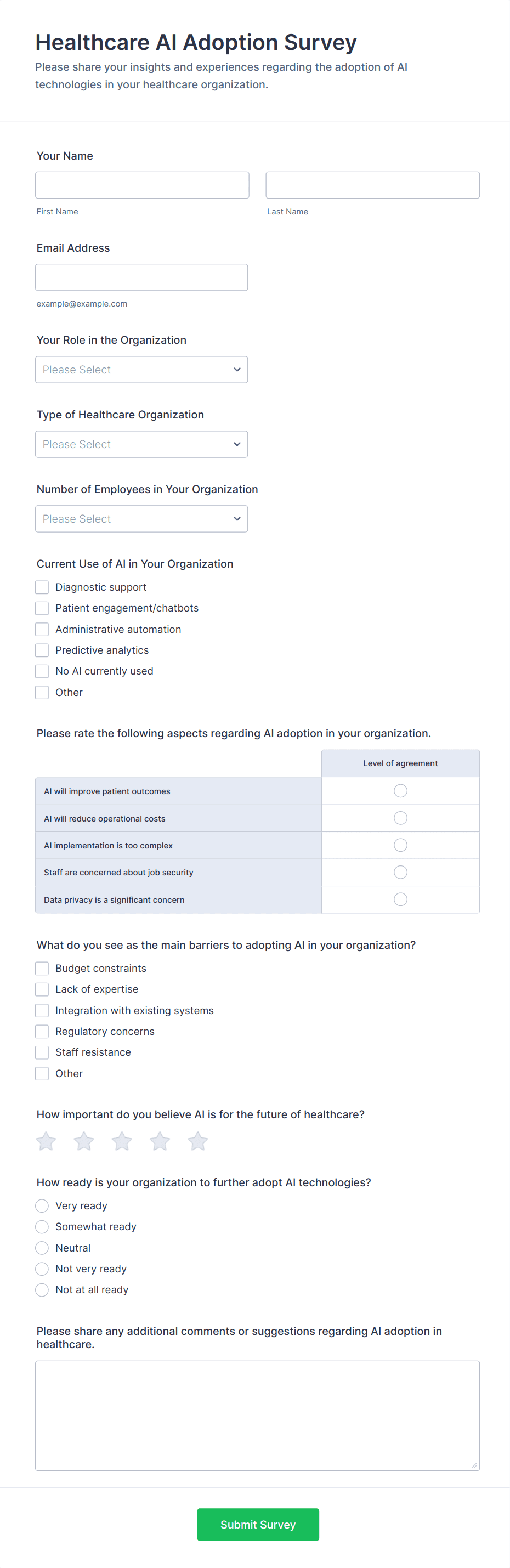 Measure organizational AI maturity with the AI Adoption Survey in Jotform, a survey template for benchmarking adoption levels, challenges, benefits, and future plans across industries and roles.