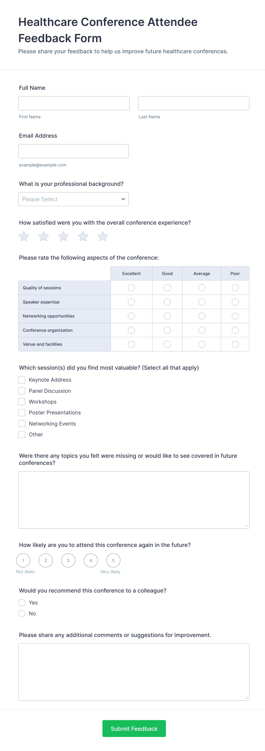 Typical fields include overall satisfaction ratings, feedback on specific sessions or speakers, venue and logistics assessments, open-ended comments, and suggestions for future events.