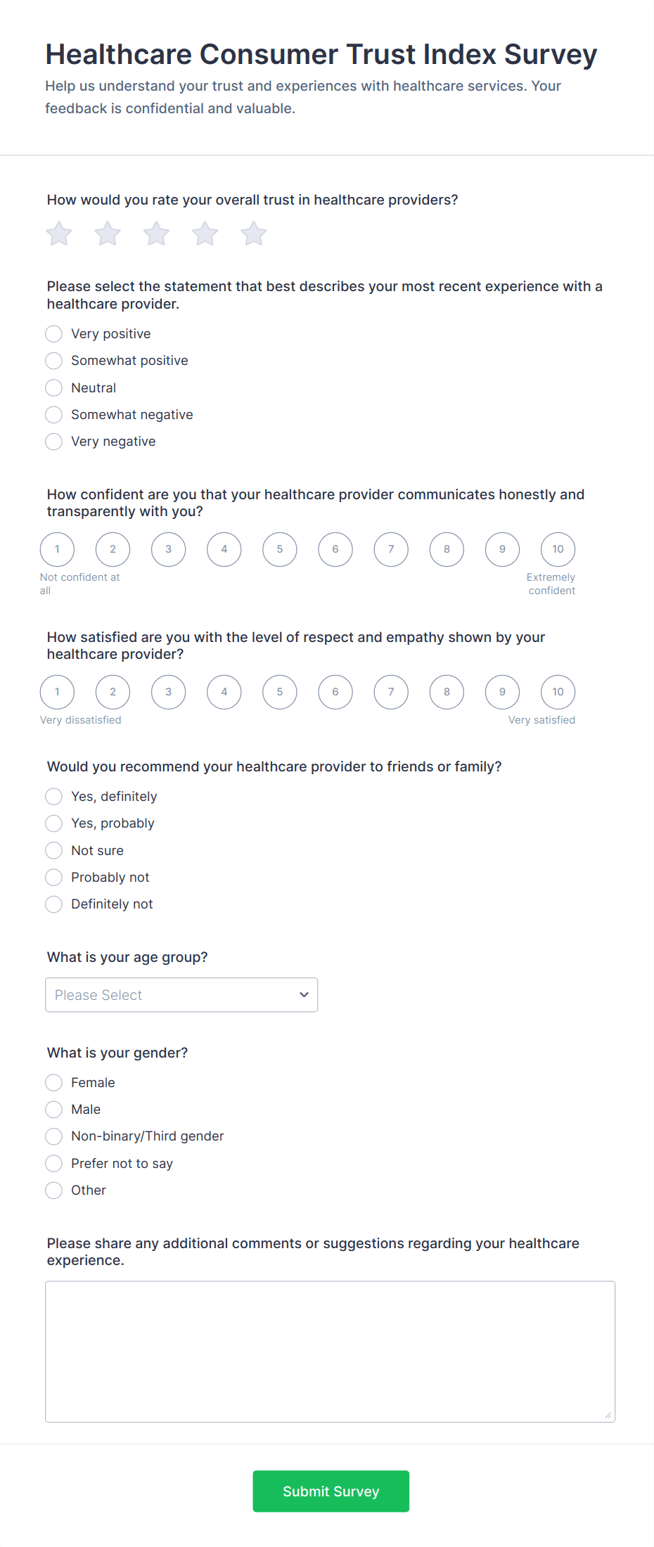 Healthcare surveys are specialized questionnaires designed to collect valuable information from patients, healthcare professionals, and other stakeholders within the medical field. These surveys can be used for a variety of purposes, such as assessing patient satisfaction, gathering feedback on healthcare services, monitoring public health trends, evaluating treatment outcomes, and conducting research studies. Healthcare organizations, clinics, hospitals, and research institutions rely on these surveys to improve patient care, streamline operations, and ensure compliance with industry standards.
