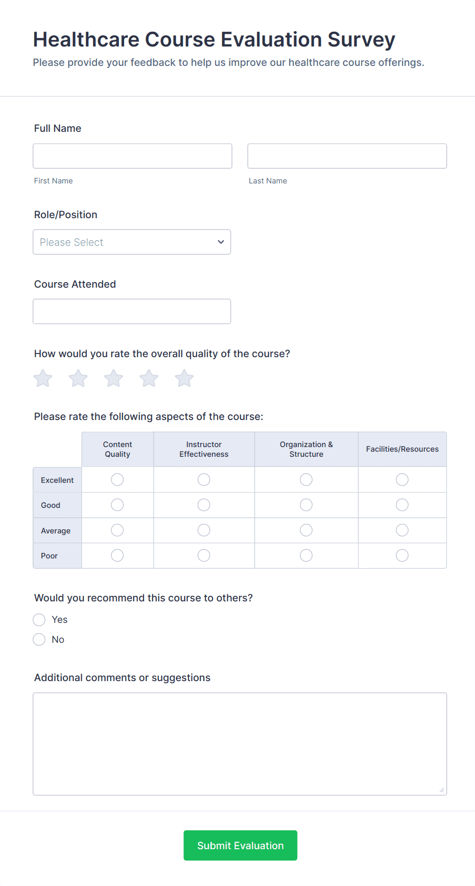 Course Evaluation Forms are essential tools used by educational institutions, training organizations, and instructors to gather feedback from students about a course’s content, delivery, and overall effectiveness. These forms help assess various aspects such as teaching methods, course materials, learning outcomes, and classroom environment. By collecting structured feedback, educators can identify strengths, pinpoint areas for improvement, and make data-driven decisions to enhance future courses. Use cases range from end-of-semester university evaluations and workshop feedback to online training assessments and continuing education reviews.