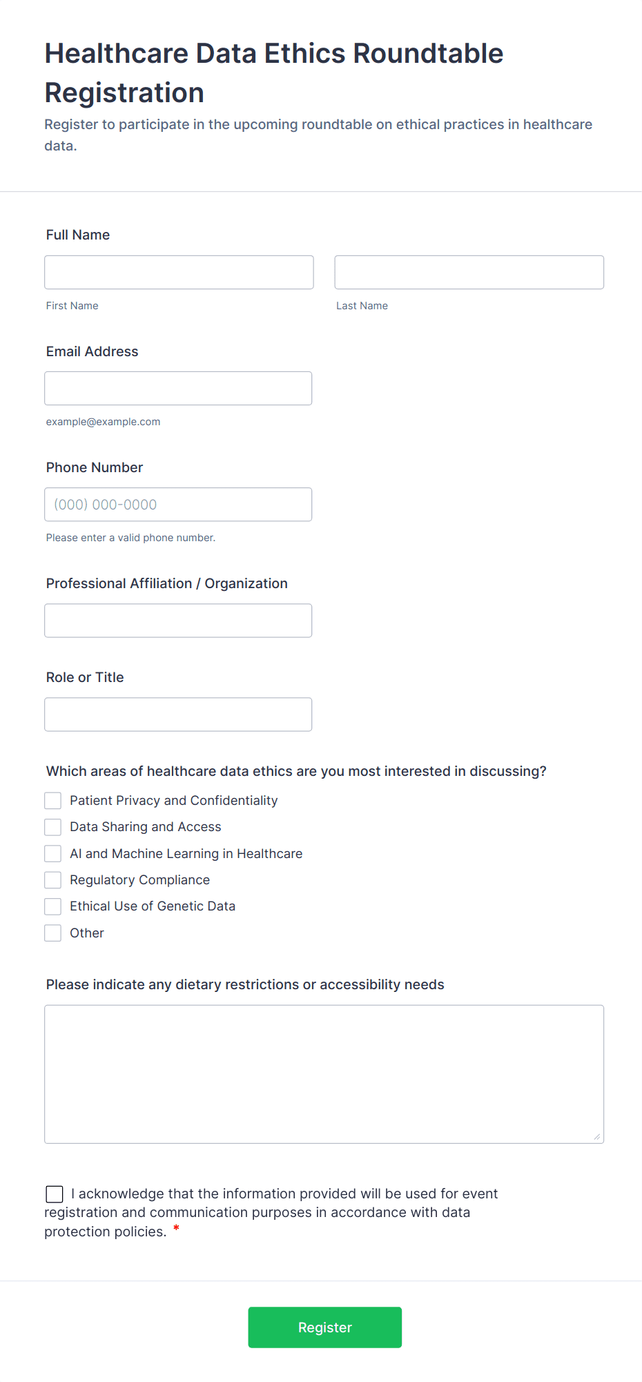 Typical fields include participant name, contact details, session selection, payment information, dietary or accessibility needs, and consent agreements.