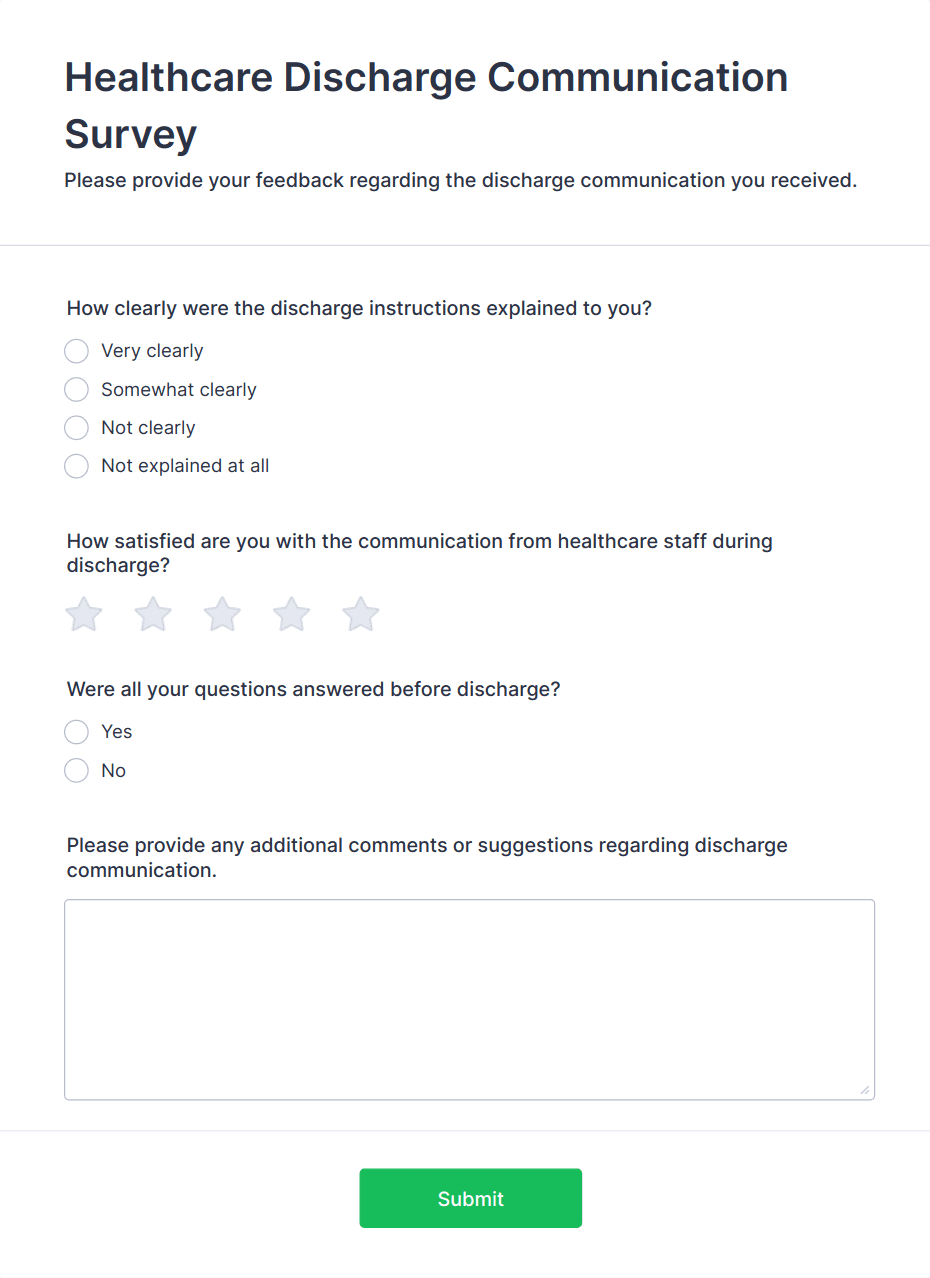 Healthcare surveys are specialized questionnaires designed to collect valuable information from patients, healthcare professionals, and other stakeholders within the medical field. These surveys can be used for a variety of purposes, such as assessing patient satisfaction, gathering feedback on healthcare services, monitoring public health trends, evaluating treatment outcomes, and conducting research studies. Healthcare organizations, clinics, hospitals, and research institutions rely on these surveys to improve patient care, streamline operations, and ensure compliance with industry standards.