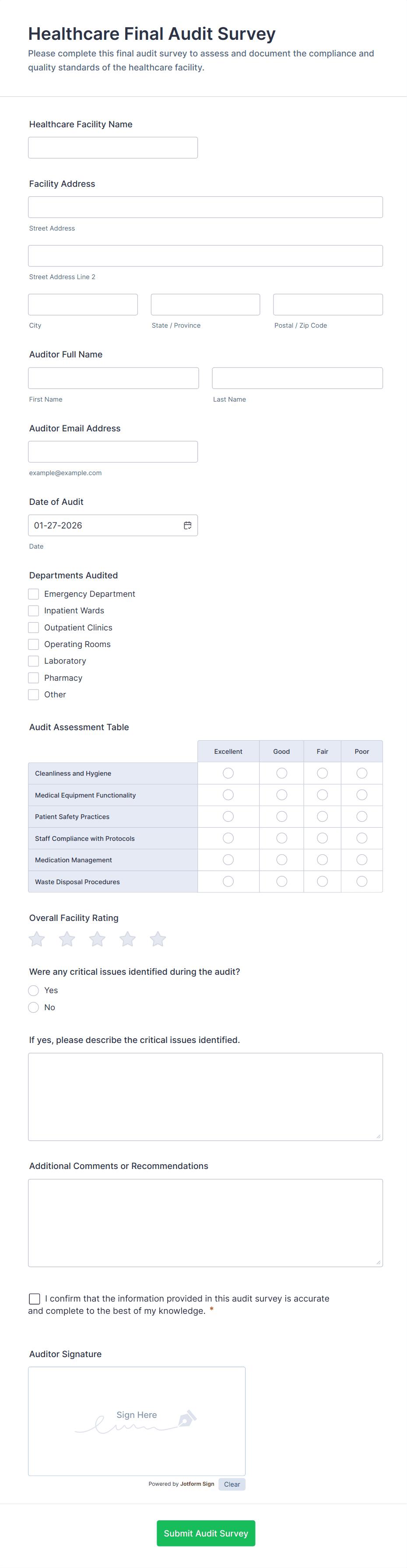 Creating an effective audit form with Jotform is straightforward and highly customizable, allowing you to address a variety of audit scenarios such as safety inspections, compliance checks, or quality control reviews. Here’s a step-by-step guide to building an audit form that fits your organization’s needs: