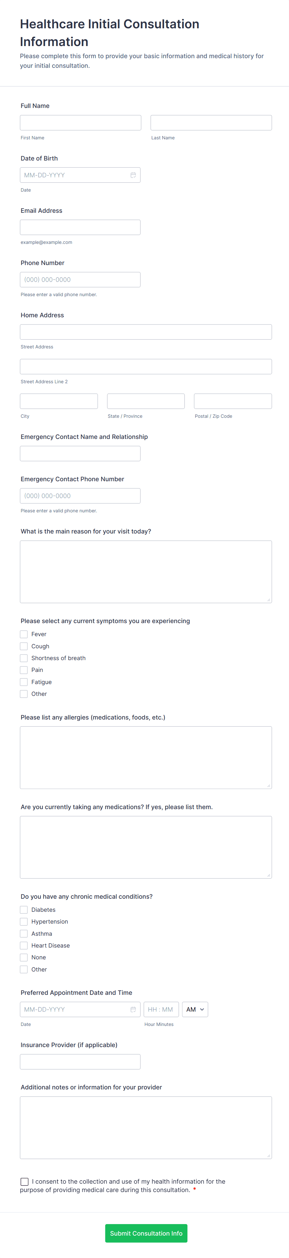 Intake forms are essential tools used to gather preliminary information from clients, patients, customers, or participants before providing a service or beginning a process. These forms streamline the onboarding process by collecting relevant details such as contact information, background data, preferences, and specific needs. Intake forms are widely used across various industries, including healthcare (patient intake), legal (client intake), education (student intake), human resources (employee onboarding), and service-based businesses (client consultations). By standardizing the information-gathering process, intake forms help organizations ensure consistency, improve efficiency, and deliver personalized experiences.