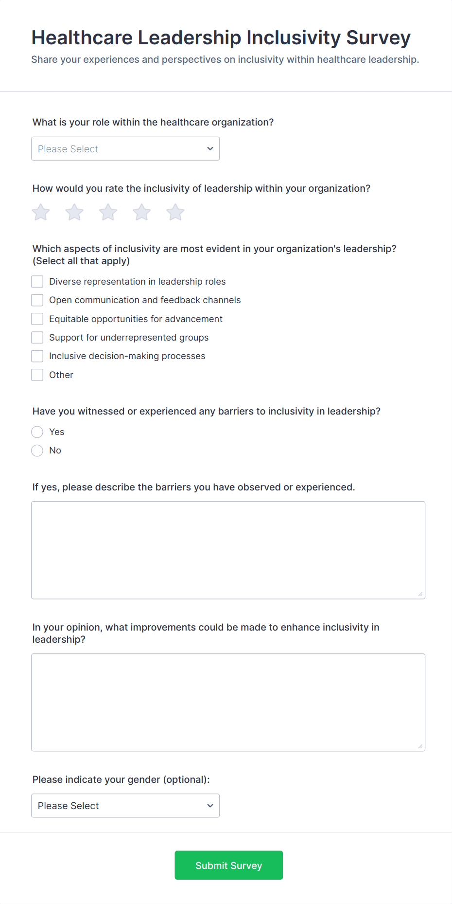 Healthcare surveys are specialized questionnaires designed to collect valuable information from patients, healthcare professionals, and other stakeholders within the medical field. These surveys can be used for a variety of purposes, such as assessing patient satisfaction, gathering feedback on healthcare services, monitoring public health trends, evaluating treatment outcomes, and conducting research studies. Healthcare organizations, clinics, hospitals, and research institutions rely on these surveys to improve patient care, streamline operations, and ensure compliance with industry standards.