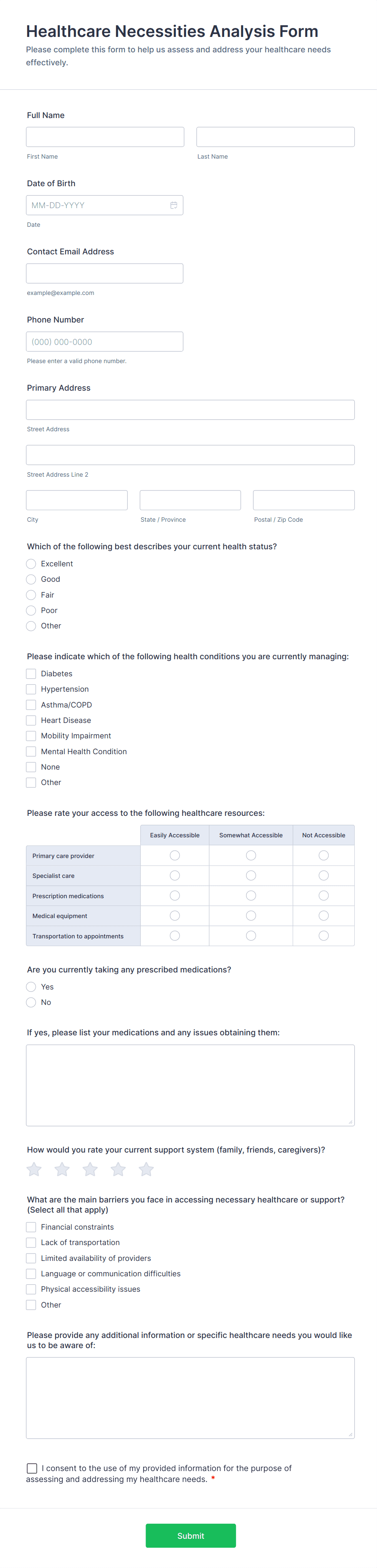The Healthcare Access Assessment Form helps healthcare providers collect essential information on patient access to medical services, identifying barriers and improving healthcare delivery.