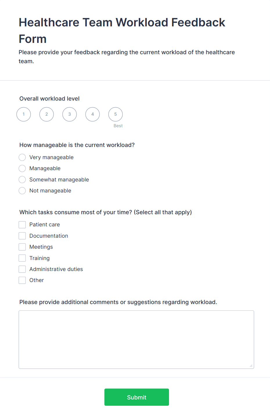Healthcare surveys are specialized questionnaires designed to collect valuable information from patients, healthcare professionals, and other stakeholders within the medical field. These surveys can be used for a variety of purposes, such as assessing patient satisfaction, gathering feedback on healthcare services, monitoring public health trends, evaluating treatment outcomes, and conducting research studies. Healthcare organizations, clinics, hospitals, and research institutions rely on these surveys to improve patient care, streamline operations, and ensure compliance with industry standards.