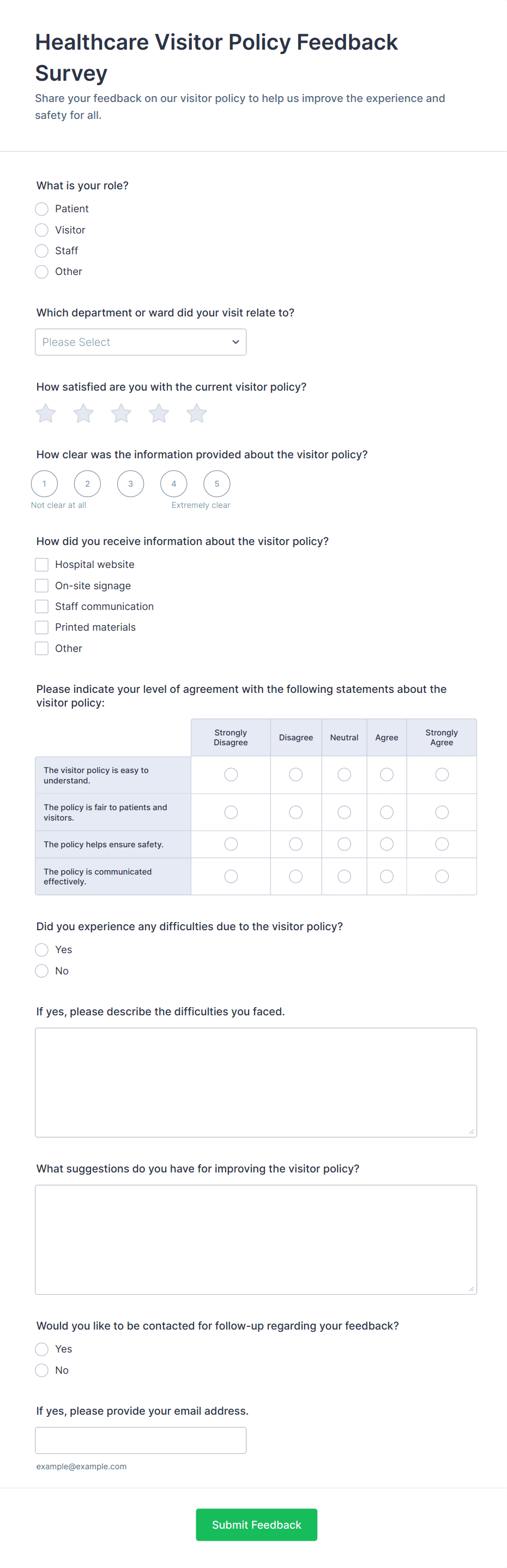 • Health-specific fields: Multiple choice for symptoms, rating scales for satisfaction, long text for open feedback.