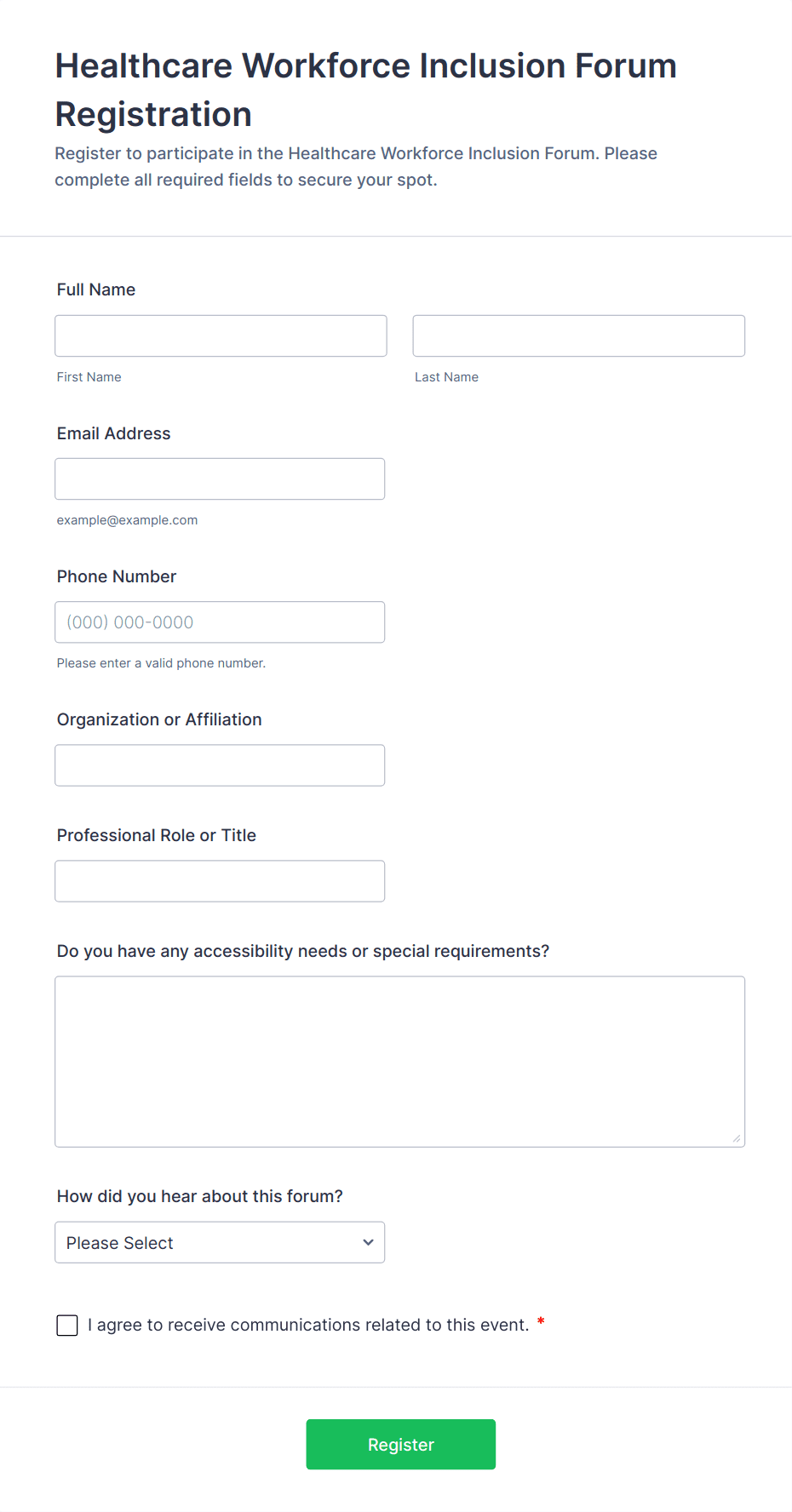 - Session or Workshop Selection (dropdowns or checkboxes)