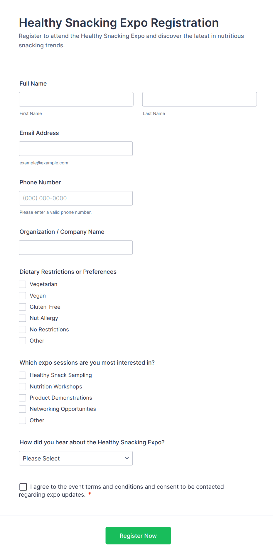 • For speaker or exhibitor forms, add fields for presentation topics, company details, or booth preferences.