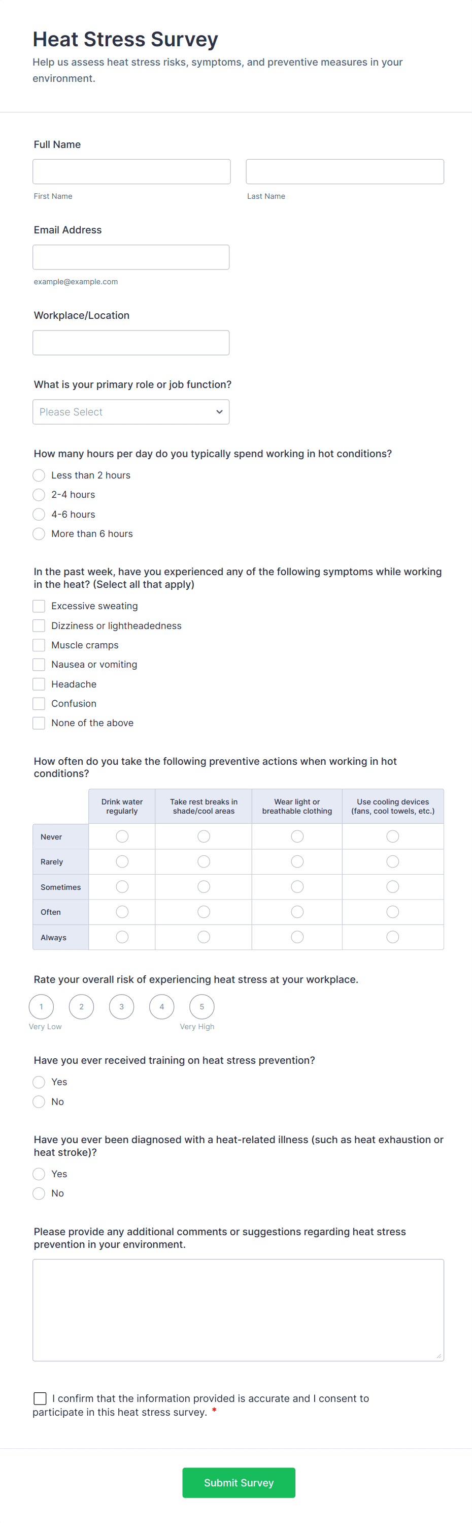 Employee Survey Templates are pre-designed forms that organizations use to gather feedback, opinions, and insights from their workforce. These templates cover a wide range of topics, including job satisfaction, workplace culture, employee engagement, training needs, performance evaluations, and more. By using employee survey templates, HR professionals, managers, and business owners can efficiently collect valuable data to understand employee sentiment, identify areas for improvement, and make informed decisions that enhance workplace productivity and morale. Common use cases include onboarding feedback, exit interviews, pulse surveys, annual engagement surveys, and 360-degree feedback.