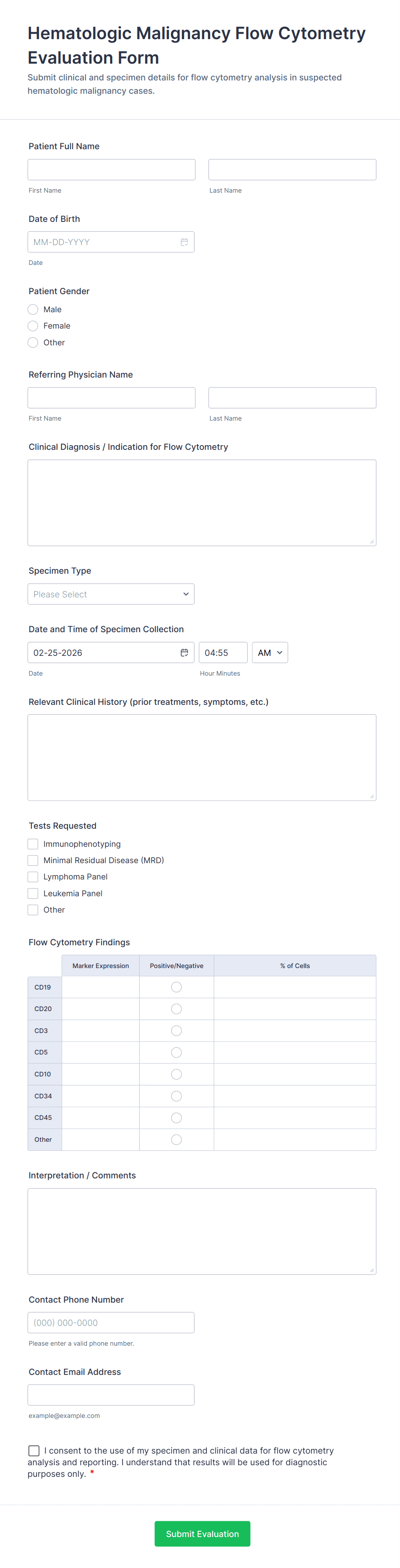 Bone Marrow Biopsy Report Form Template for documenting procedure details and diagnostic findings, suitable for clinics, hospitals, and labs that need consistent data collection and organized form submission in Jotform.