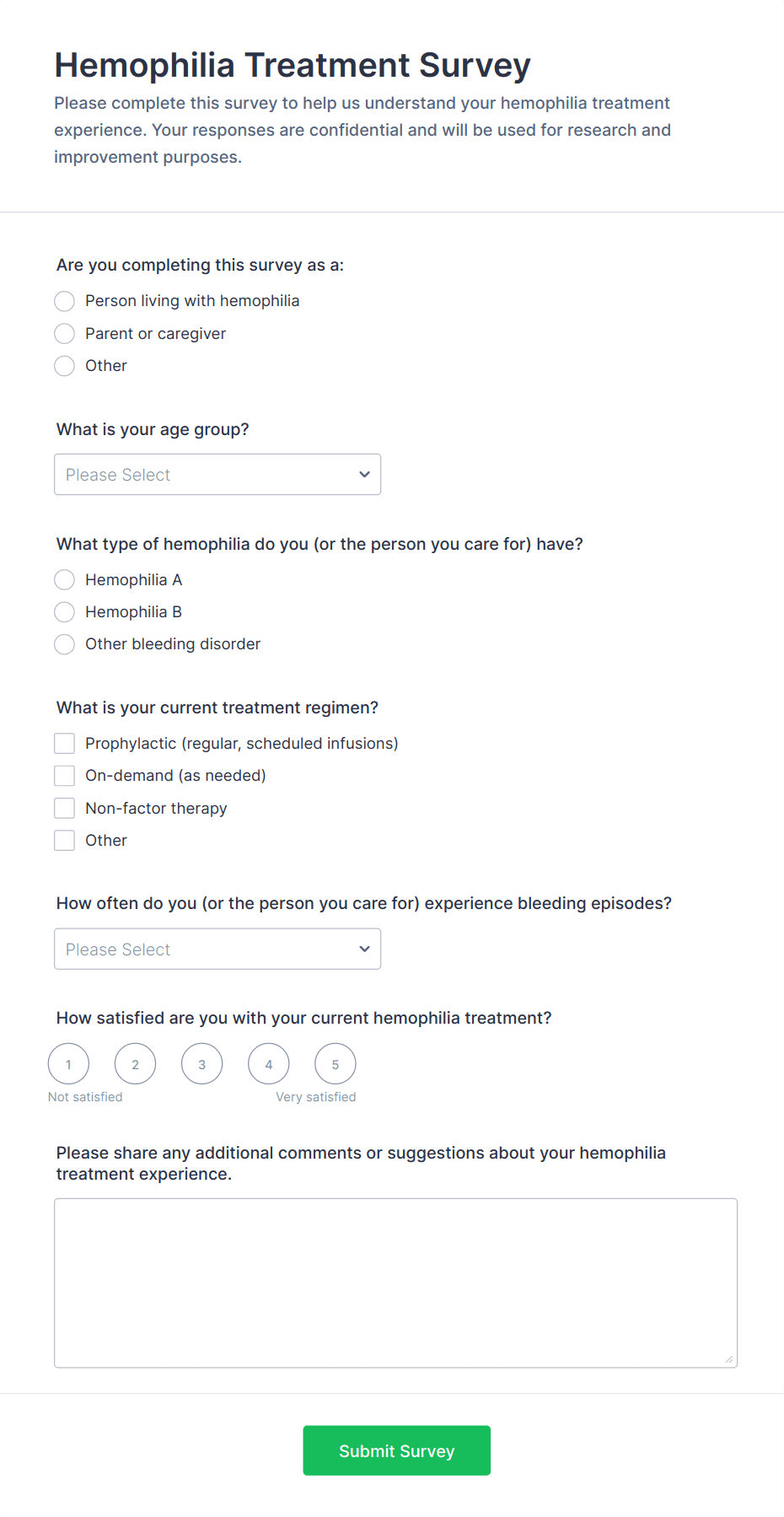 Medical surveys and questionnaires are essential tools used by healthcare professionals, researchers, clinics, and organizations to collect valuable information about patients’ health, medical histories, symptoms, treatment outcomes, and overall well-being. These forms can be used for a variety of purposes, such as patient intake, health risk assessments, satisfaction surveys, mental health screenings, post-visit feedback, and clinical research studies. By gathering structured data directly from patients or study participants, medical surveys and questionnaires help streamline workflows, improve patient care, and support evidence-based decision-making in healthcare settings.