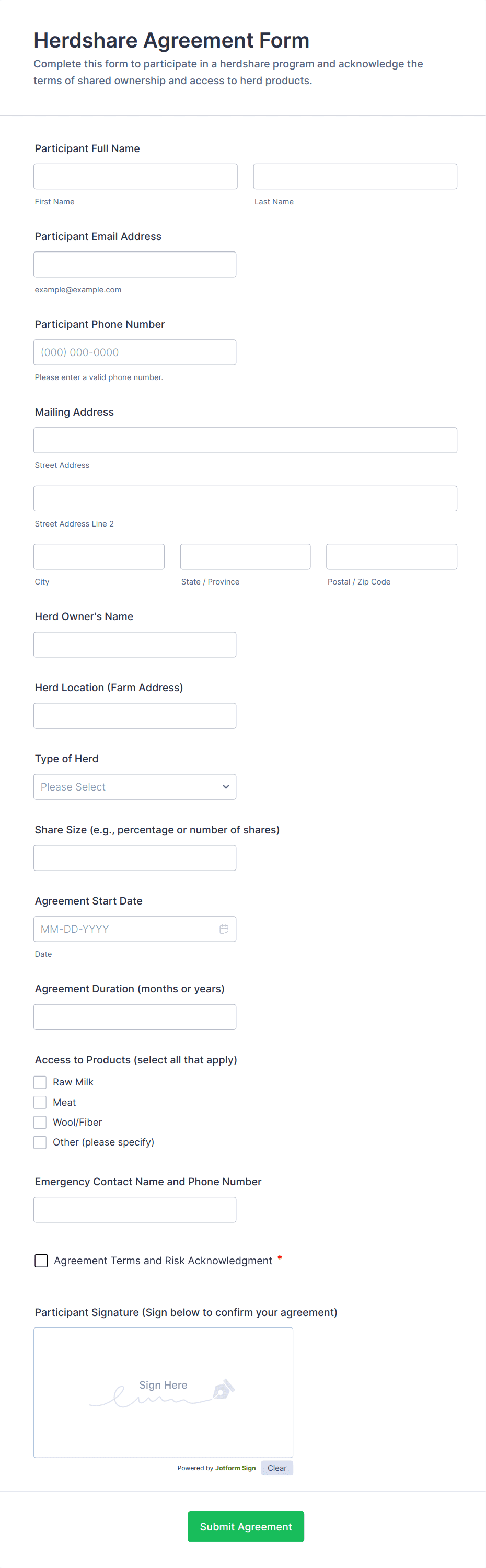 Collect and manage information for your farm with free online Farmer Forms. Whether you’re filling out land lease agreements, selling your products, or collecting worker applications, choose a template below and customize it to perfectly match your needs with our drag-and-drop builder. No coding required! You can then embed your form in your website, share it with a link, or fill it out yourself directly from your smartphone, tablet, or computer. Stop tracking information with pen and paper and upgrade to online Farmer Forms that work great on any device.