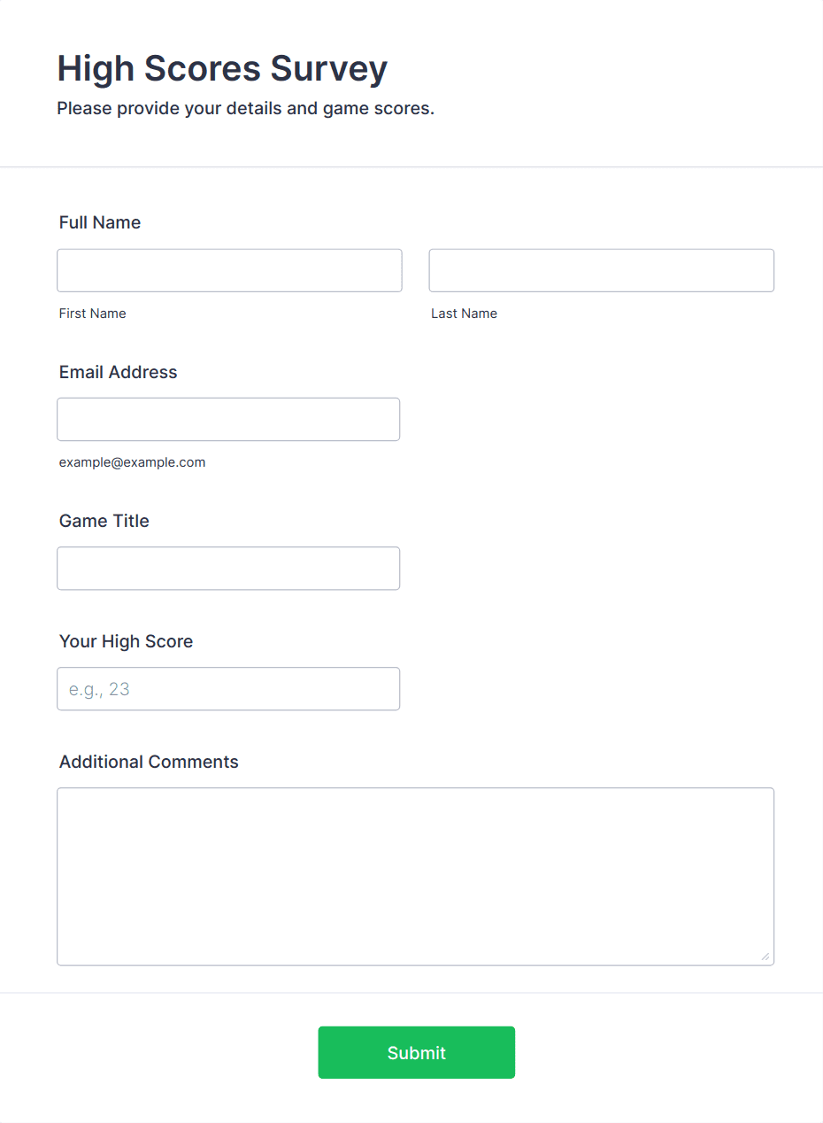 A High Scores Survey should include fields for player name or handle, contact information, game title, platform, score details, proof of score if needed, and optional feedback questions about the gaming experience.